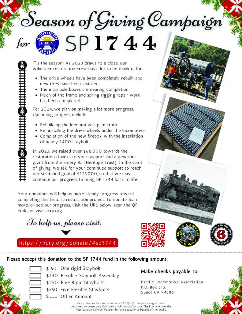 How quickly time flies! We find ourselves in the midst of yet another Sold Out Train of Lights season, having concluded what feels like the first “normal” year in a long time. Thanks to our tireless volunteer efforts, we’ve continued to run both steam and diesel trains, with many being sold out during the year; we’ve resumed our popular Beer Trains, we’ve hosted a variety of special events, including charters, M-200 runs, and Speeder Runs, made continued progress in our efforts to build East, and have continued to make steady progress on our many restoration projects. As with last year, we’d like to continue to highlight the Southern Pacific #1744 restoration.