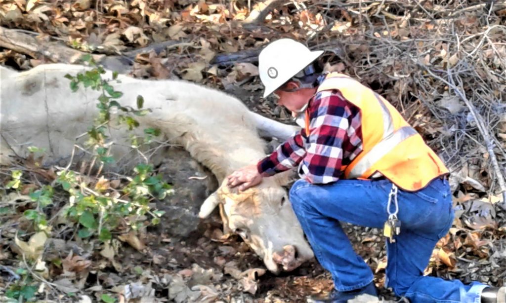 NCRy volunteer, Doug Vanderlee, comforts the exhausted cow while waiting for help to arrive.