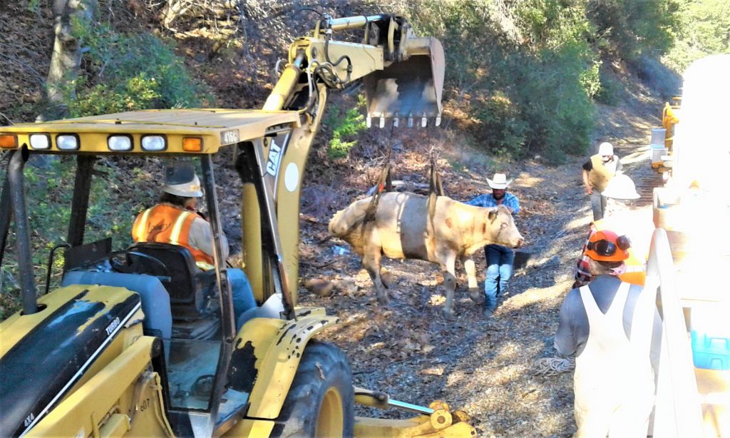 On Sunday, January 17th, 2021, two volunteers were working out in the canyon to clean up a very large oak tree that had broken in two, creating a fire hazard.  On their way, they spotted an adult cow that had slid down a hill, under a barbed wire fence and lodged itself between a couple of solid rocks at the base of the slope, 15 feet from our railroad tracks.  The animal was alive, alert, and laying on its side, but because of its position, was unable to get itself up.