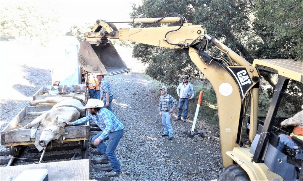 In short order the ranch hands threaded a couple of nylon soft slings provided by the railroad under the cow, and attached them to the bucket of the backhoe.  The cow was hoisted onto a railroad maintenance “pushcar”, then transported on the tracks 1/4 mile to an access gate through an adjoining neighbor’s property where it was hoisted off onto an awaiting trailer.  It was very lucky that the neighbor happened to be working on the property at the time to permit access.  All indications are that the cow was not severely injured by the accident and will make a full recovery and will be suckling little calves of her own in the late Spring.