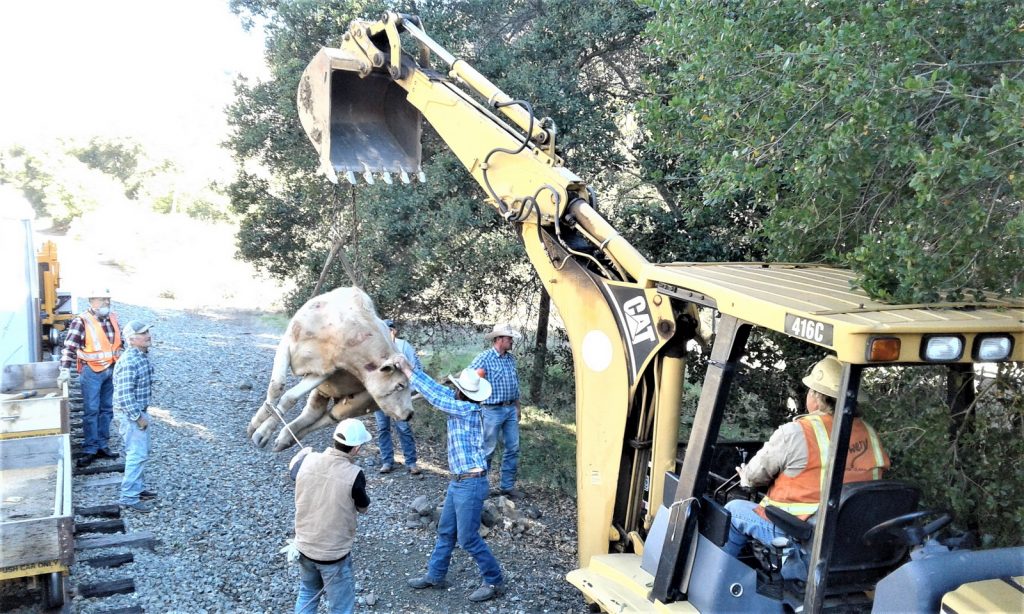 Using a list of neighbors’ contact information maintained by our museum for such an emergency, the railroad volunteers were able to locate the correct cattle rancher and direct him to the site.  The ranch foreman arrived to assess the situation.  It was a cattleman’s worst nightmare; a downed (and possibly injured) animal weighing 500 to 600 pounds in a place inaccessible to trucks and trailers or horses and cowboys to deal with the scenario using the traditional methods.  Short of air-lifting the cow using a helicopter, there were no easy solutions to the problem.