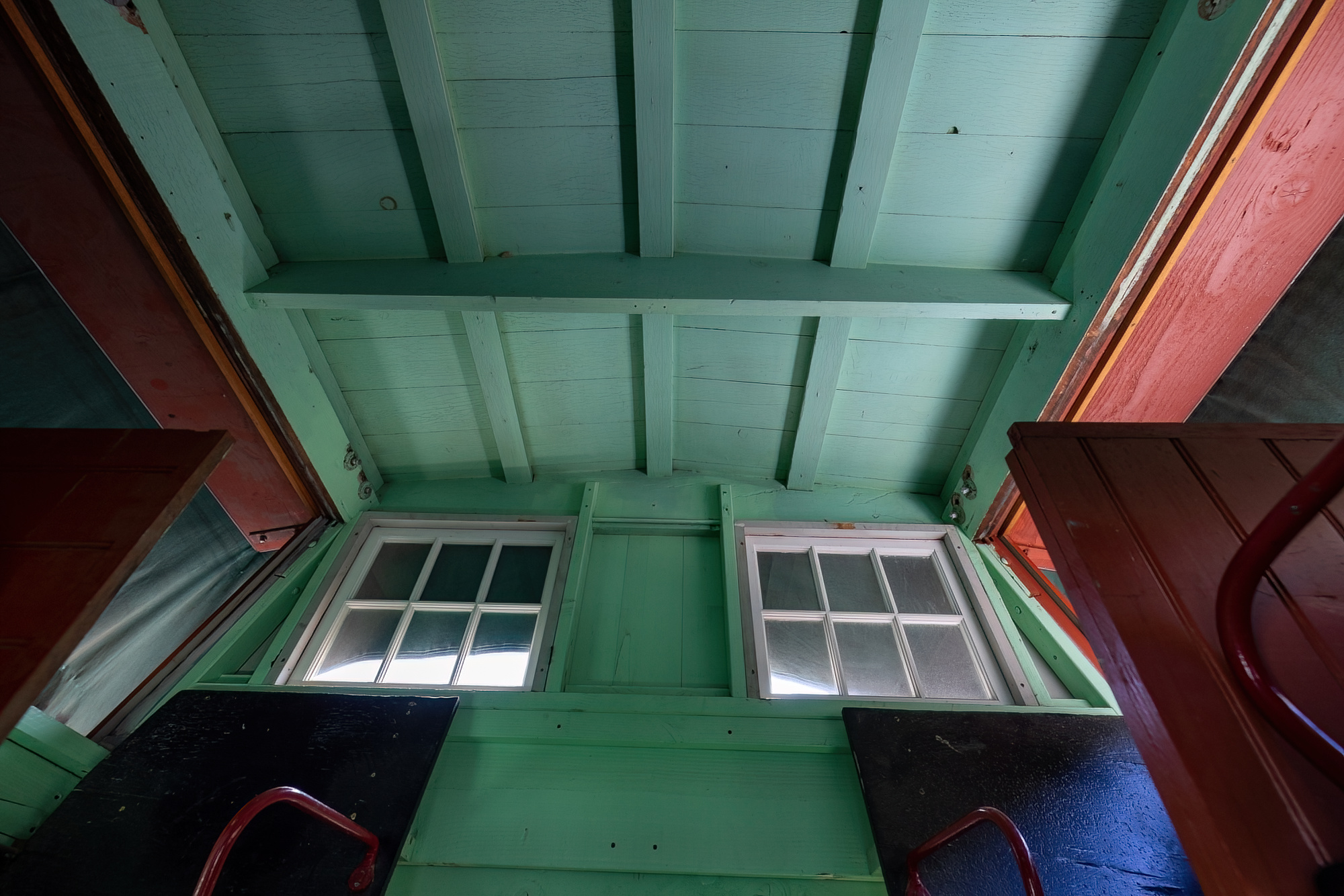 Moving the caboose was not without challenges as development around the Smith homestead including the BART tracks made it extremely difficult for truck access. The cupola was removed after several weeks of preparation to make the caboose a legal height load. The day of movement to Brightside on June 9, 2011 started with the difficult job of turning a 70’ tractor trailer in a 75’ yard. Once the lowboy truck was in place the caboose was winched forward on crude snap track. The rail was rusty, the wheels were rusty and the truck bolster had not rotated in nearly half a century. As the trucker slowly winched the car towards the trailer, the rear truck, lead axle, outside wheel flange smoothly and quietly climbed the rail, traversed the head and dropped to the ground. With two track jacks, a 3-ton come-a-long and some creative ingenuity, the truck was re-railed and caboose moved to Brightside.