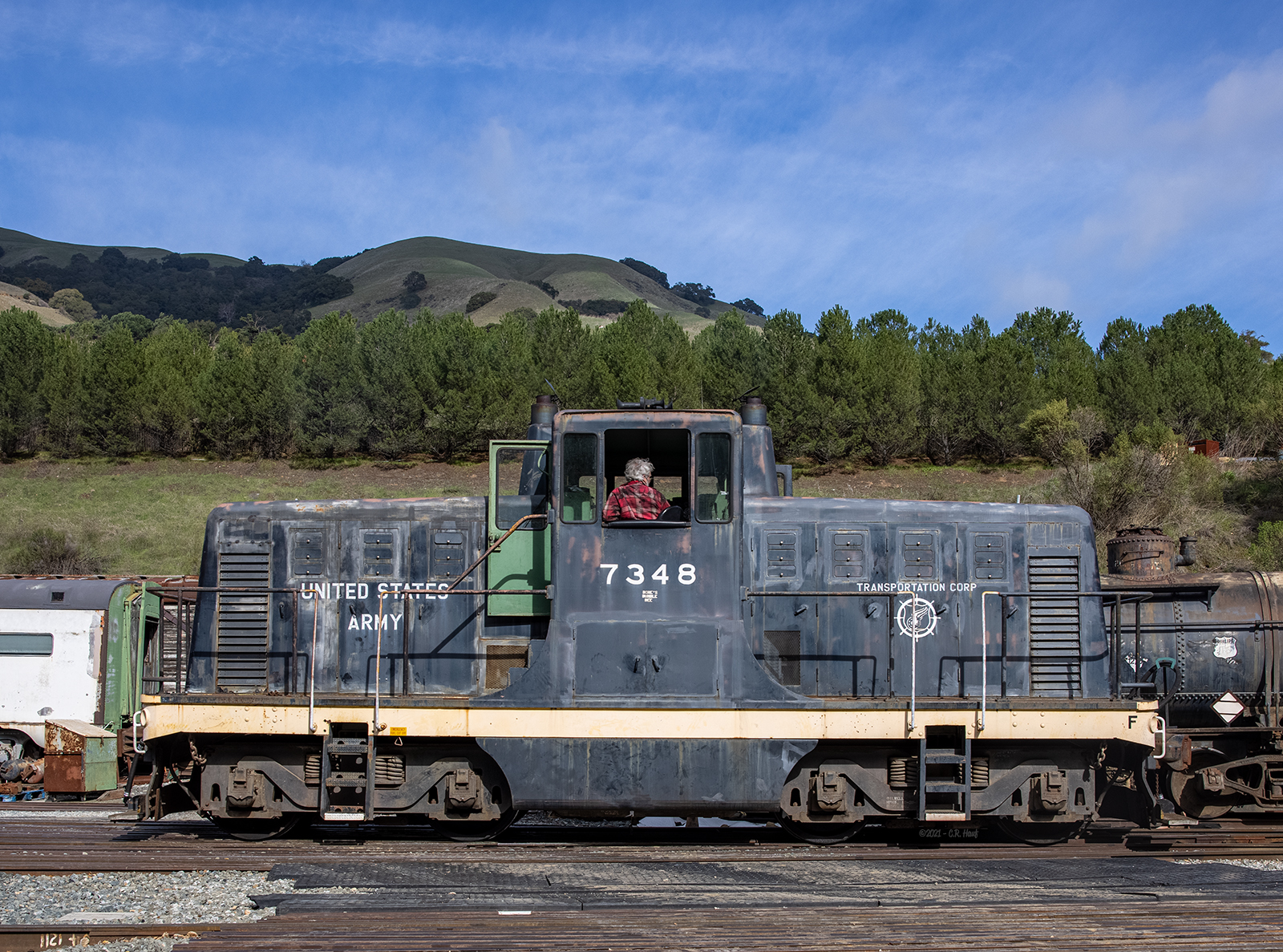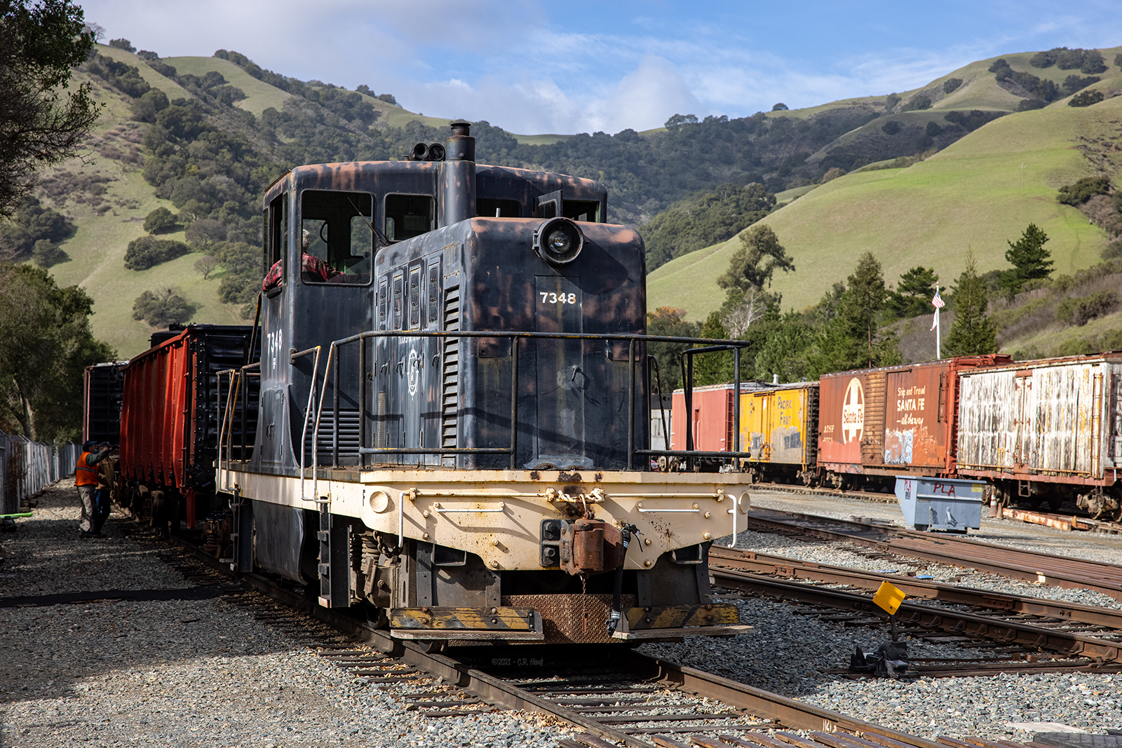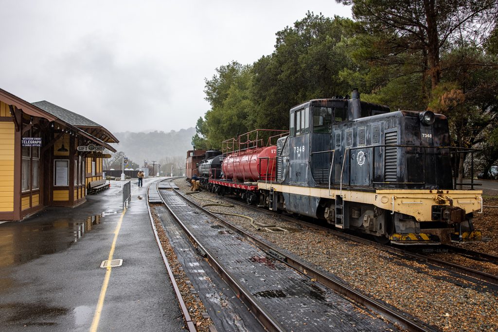 #7348 switching in Brightside Yard on 2/13/2021. Photo by; Chris Hauf – Used with permission#7348 shows off its center cab design which makes the engine ideal for switching since it has the same sight distance in either direction. 2/13/2021 Photo by: Chris Hauf – Used with permissionWhile primarily used around Brightside yard, #7348 occasionally heads out on the railroad for mainly railroad related work. Here it is in Sunol as water is being loaded into our McCloud fire car and one of our tank cars for use in the yard. 1/2/2021 Photo by: Chris Hauf – Used with permission