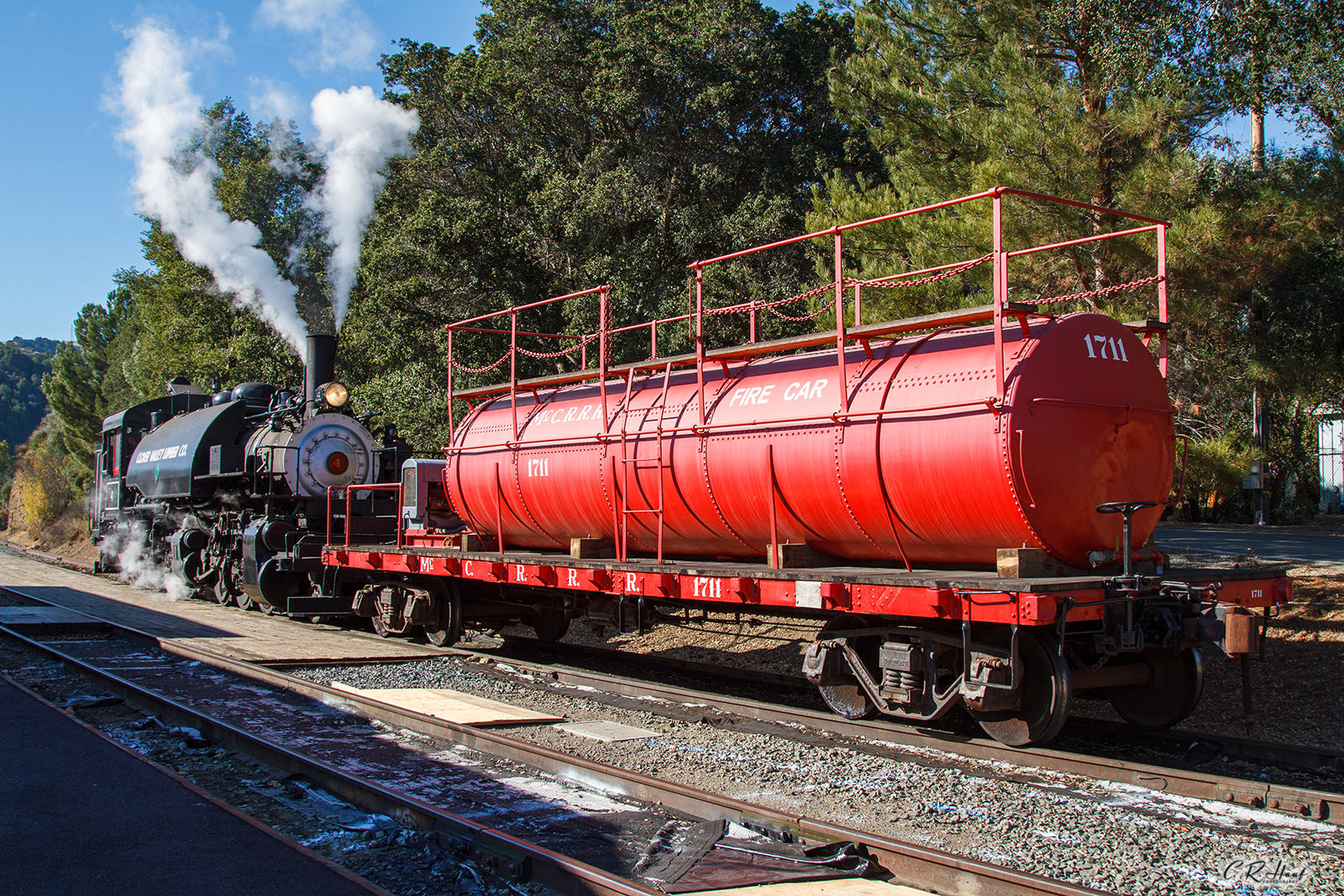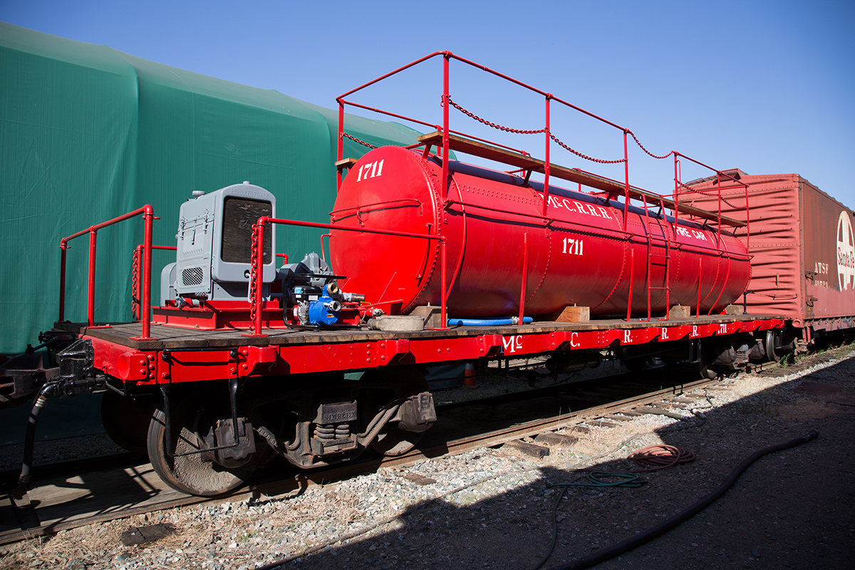 History: Built new as McCloud River Railroad outside framed boxcar #3029. The railroad converted the car to log flatcar #2325 in 1938. In July 1941, the McCloud Shops added a tank and fire pump to make fire car #1711. PLA purchased the car from the McCloud Railroad in 2012. Car was trucked from McCloud to Brightside on August 10, 2012. Car was restored in 2014 to its livery as worn on the McCloud and outfitted as a water car to support the steam program.