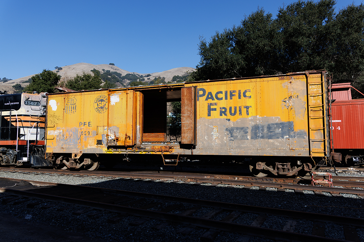 History: Pacific Fruit Express (PFE) #10591; Second to last class of Ice Refrigerator Cars (R-40-28, last class of ice cars also built in 1957). Donated by PFE to CSRM, 11/1978; Donated to by CSRM to PLA and moved to Niles Canyon 2008. Operational, Brightside, CA