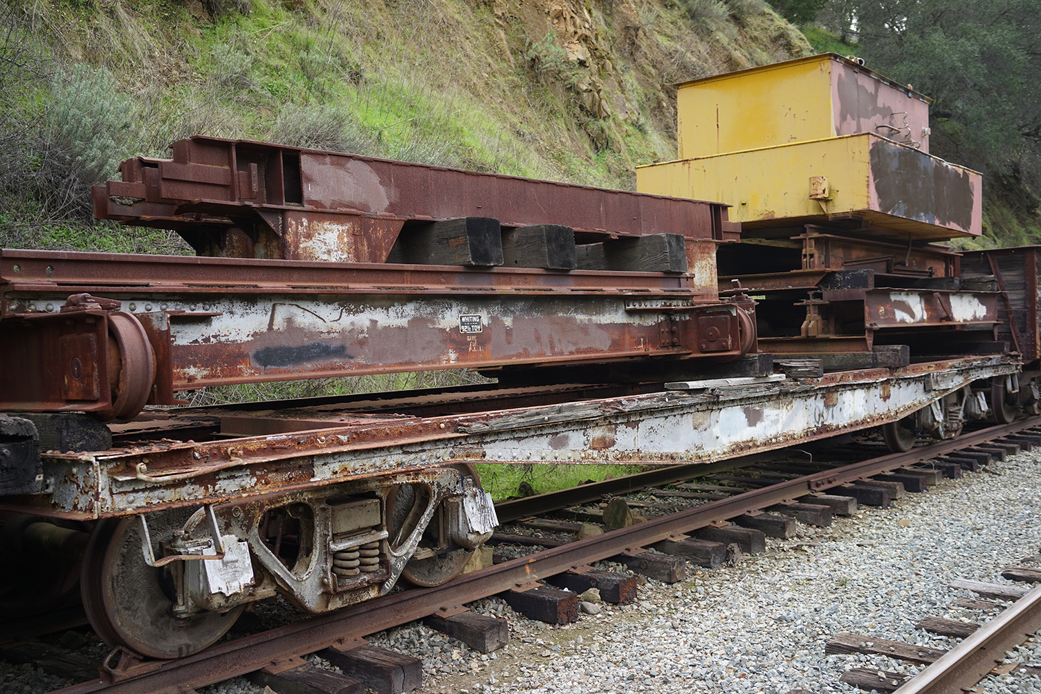 History: unknown original builder, converted into Alameda Belt Line flat car for Ferry Slip Idler Car Service, Alameda, CA; moved to Oakland Terminal Railway (date unknown) and used as parts storage for the Southern Pacific #2467 restoration project by the PLA; moved to Niles Canyon (2005) and brakes repaired. Currently used for material storage, Brightside, CA