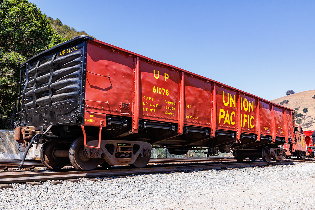 Gondola Gunderson, 1960, G-70-6 45′-10″ IL / Steel, 16 Door Bottom Dump Gondola / Capy 70 ton History: Built new as UP 61078; Donated to the PLA by the UP, 2008; Stored servicable and undergoing restoration 2020-2021 to as built UP lettering, Brightside, CA