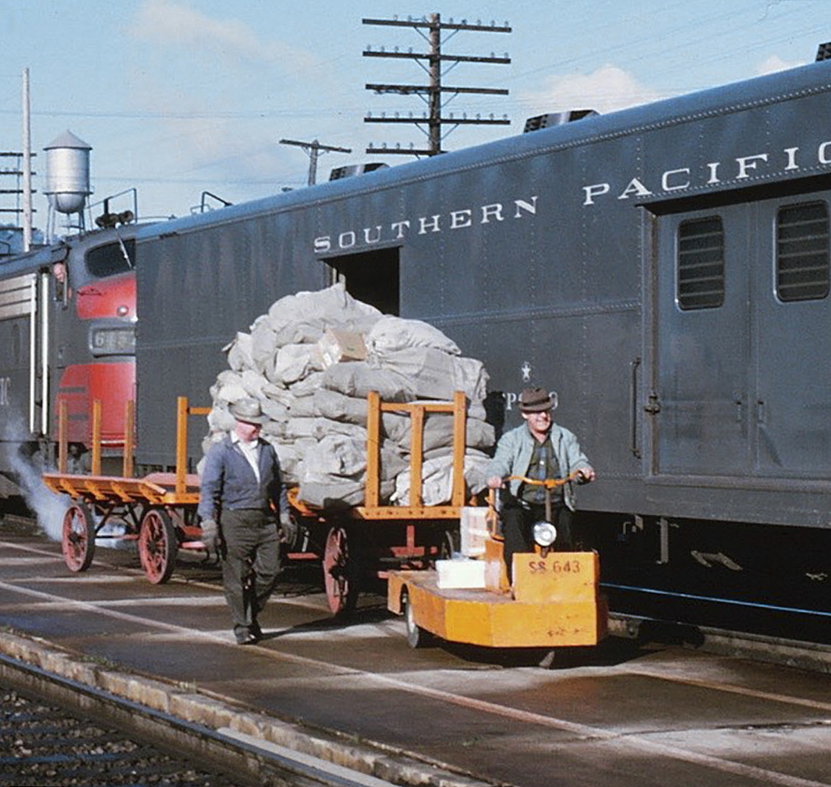 They were ordered at the outset of the final decade of SP’s passenger train service, already running at a considerable loss due to airline and superhighway competition. Their simple construction gave them the nickname Economy Baggage — probably intended as much to reassure stockholders as it was to indicate the the spartan nature of the car’s construction.