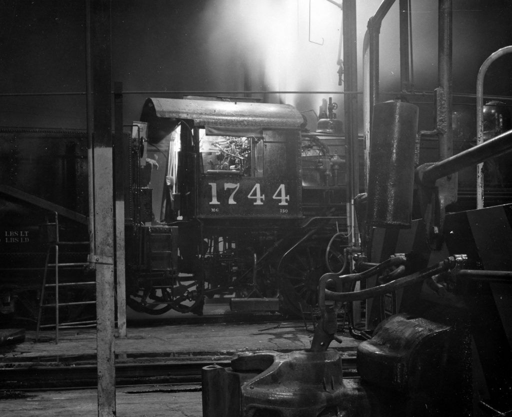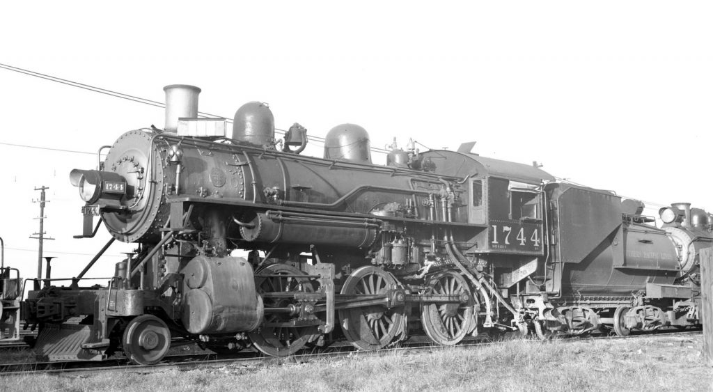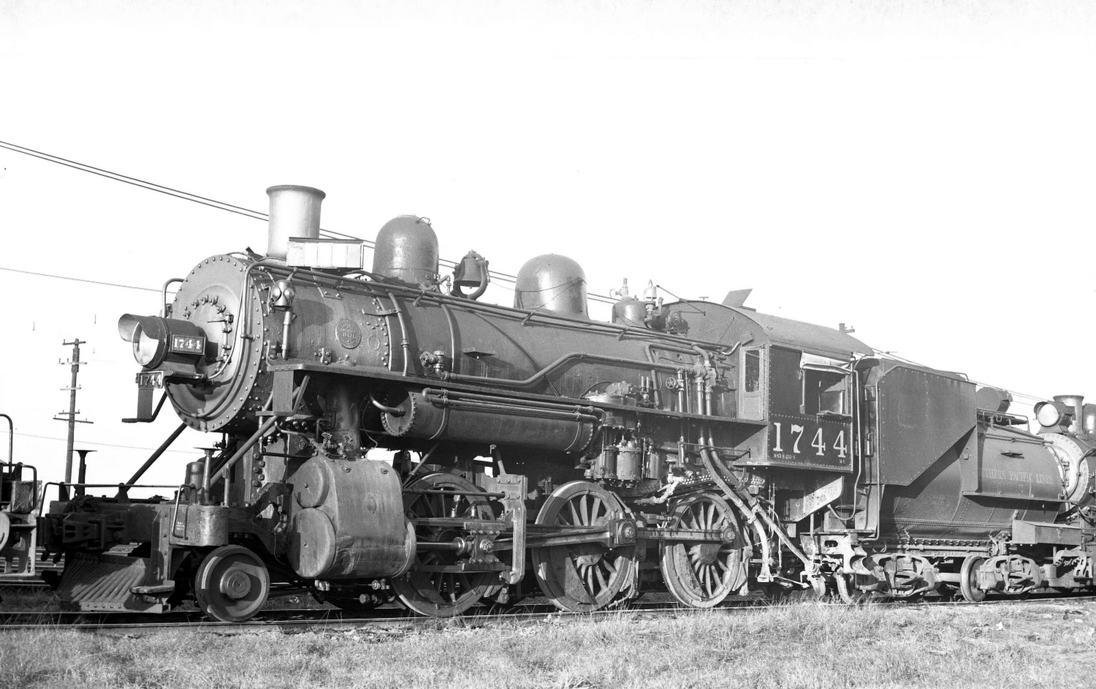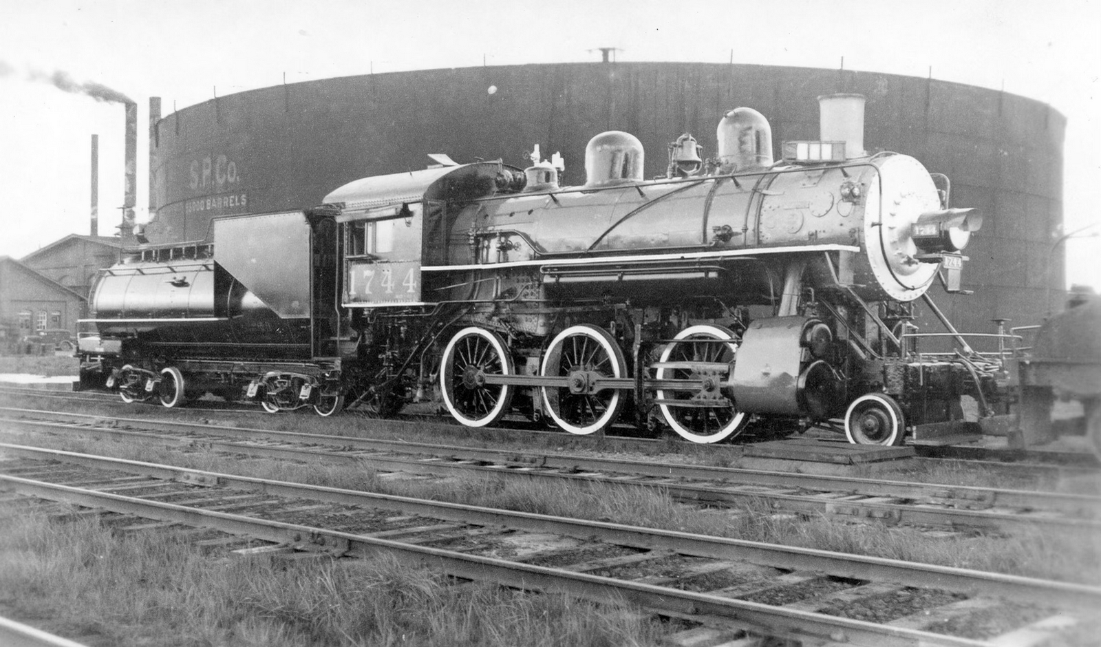 We have been given access to this wonderful collection of early 1744 photos by the Pacific Northwest Rail Archives. Of most interest is the first photo which is the only one that has turned up so far of the locomotive in its original compound as-built form. In addition to the compound cylinders, note the acetylene genenerator on the running board in front of the cab and its mating headlight mounted on top of the smoke box. As usual, captions are included with each enlarged photo.
