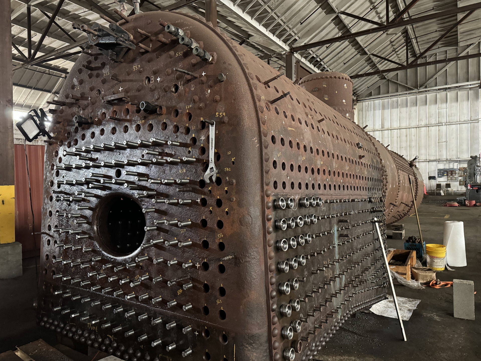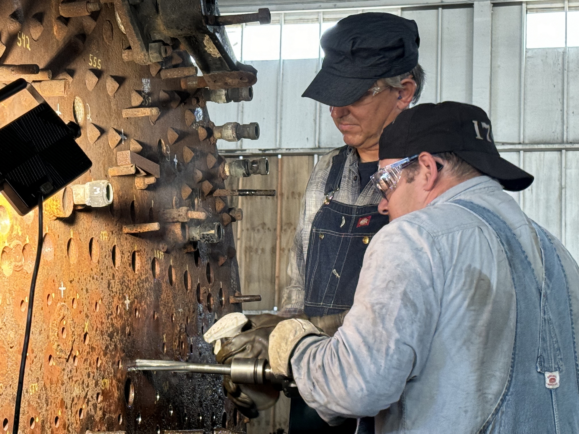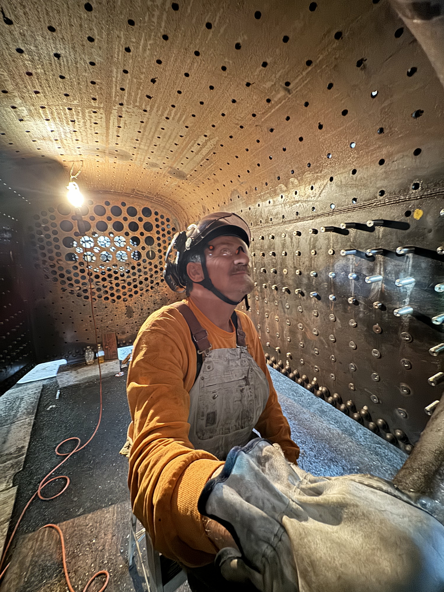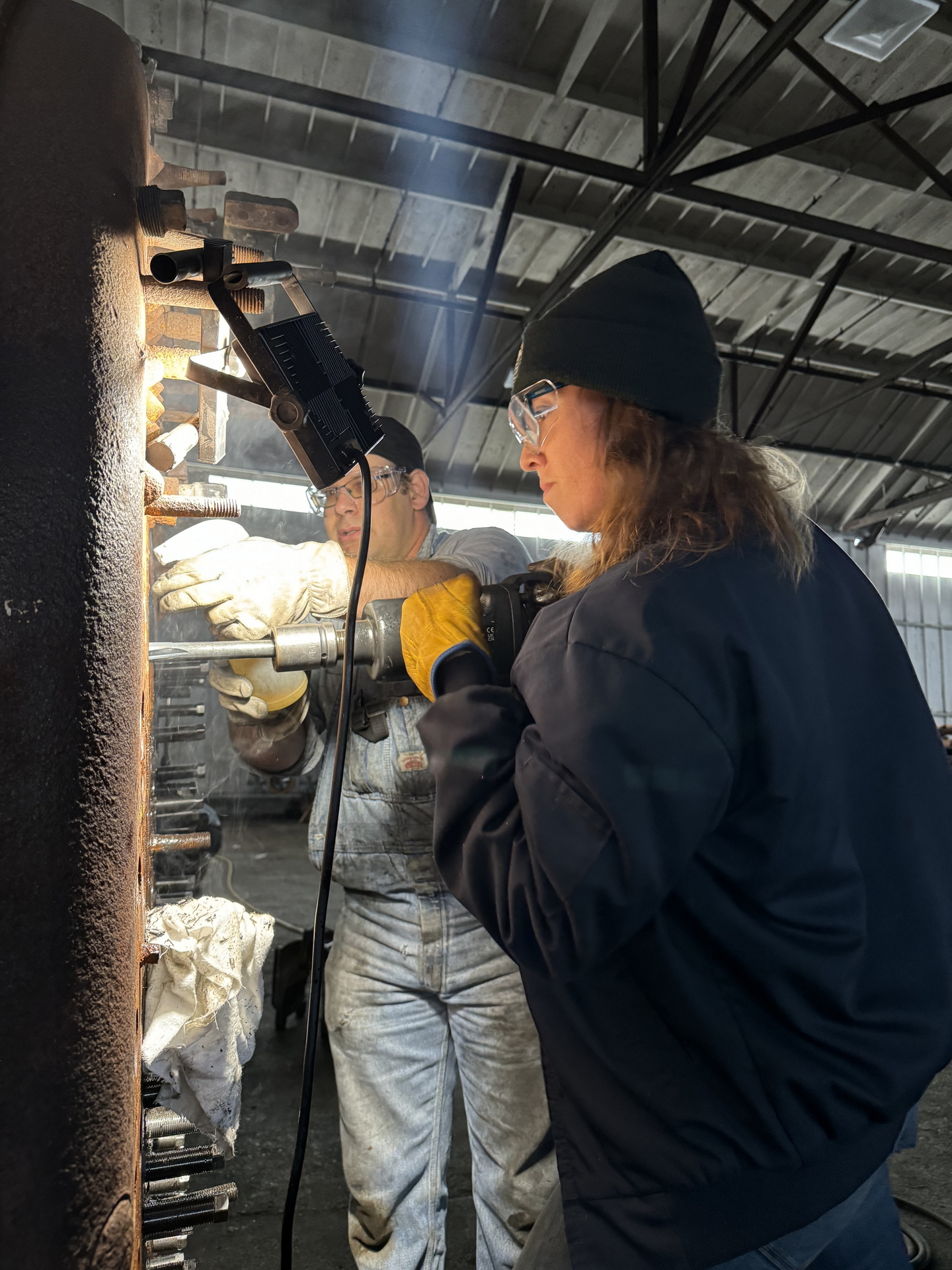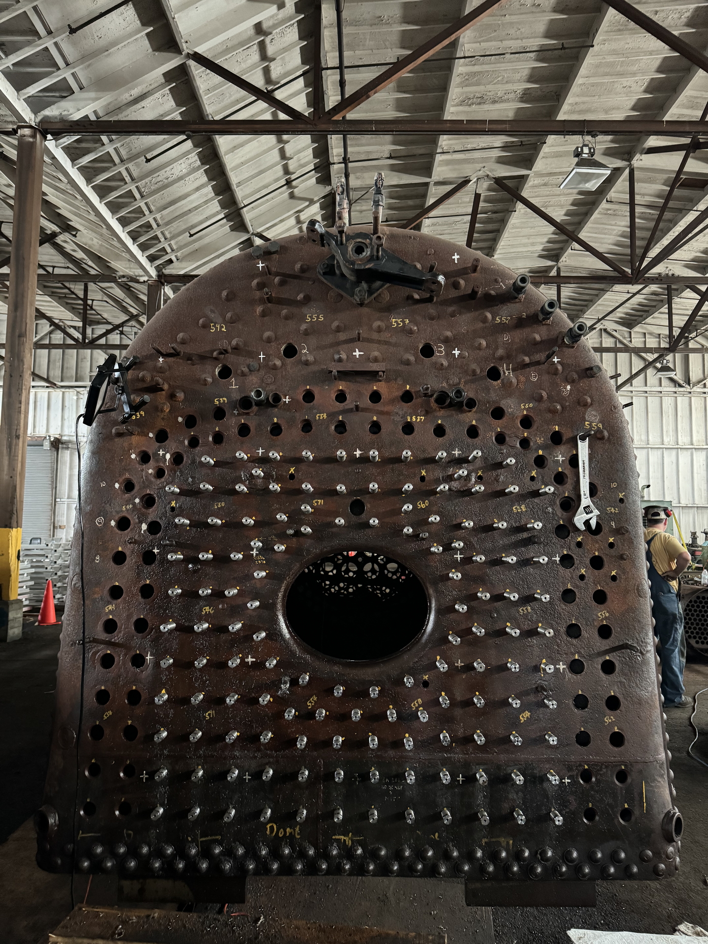 On the weekend of October 26th and 27th, a crew of six volunteers from our Niles Canyon Railway Steam Department headed north to the shop of our contractor, Stockton Locomotive Works, to do some more work on the boiler for our Southern Pacific steam locomotive #1744. Two other crews of volunteers had already gone up at different times between late 2023 and late 2024 to supplement our contractor’s resources since the boiler is seeing significant rebuilding.