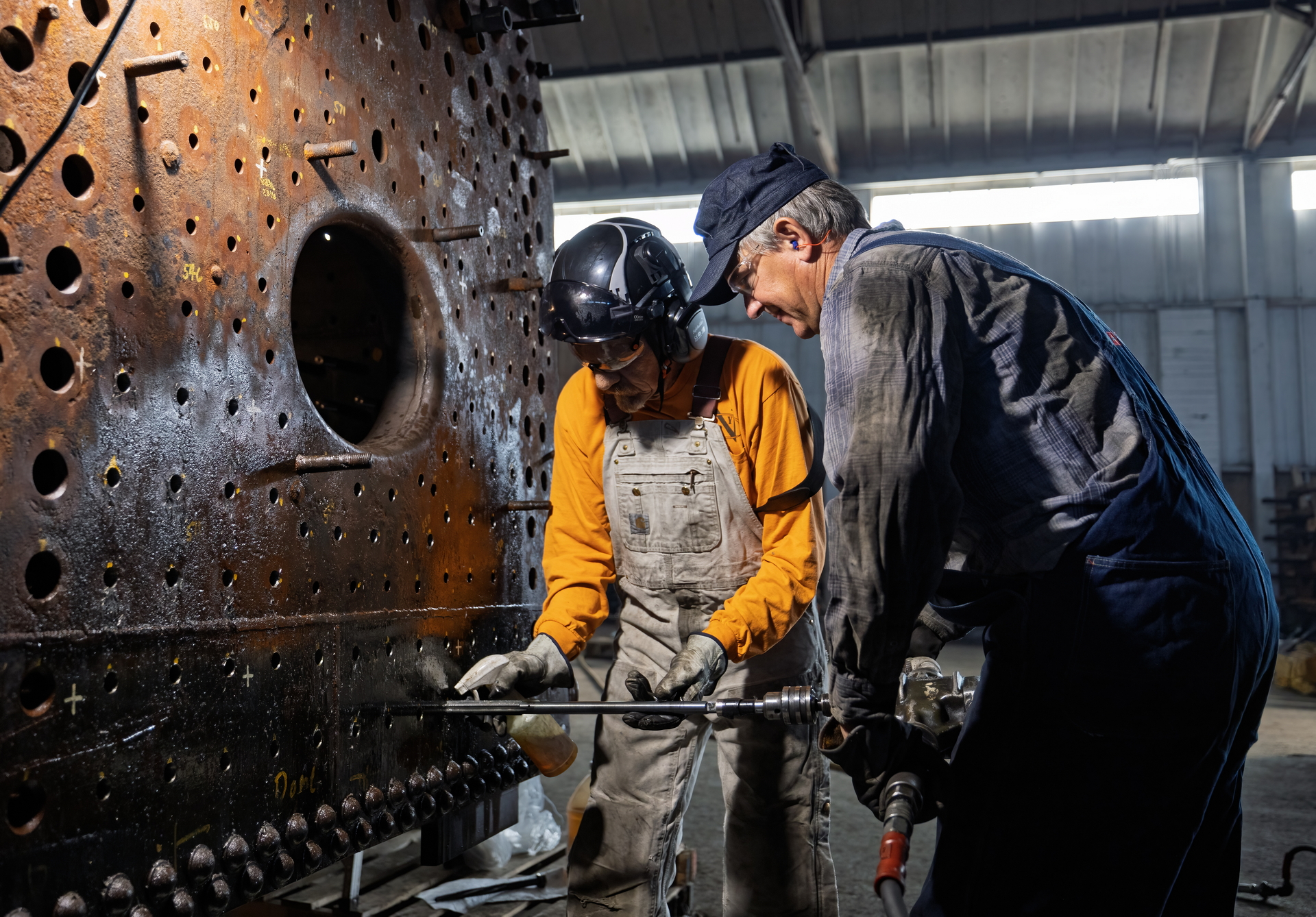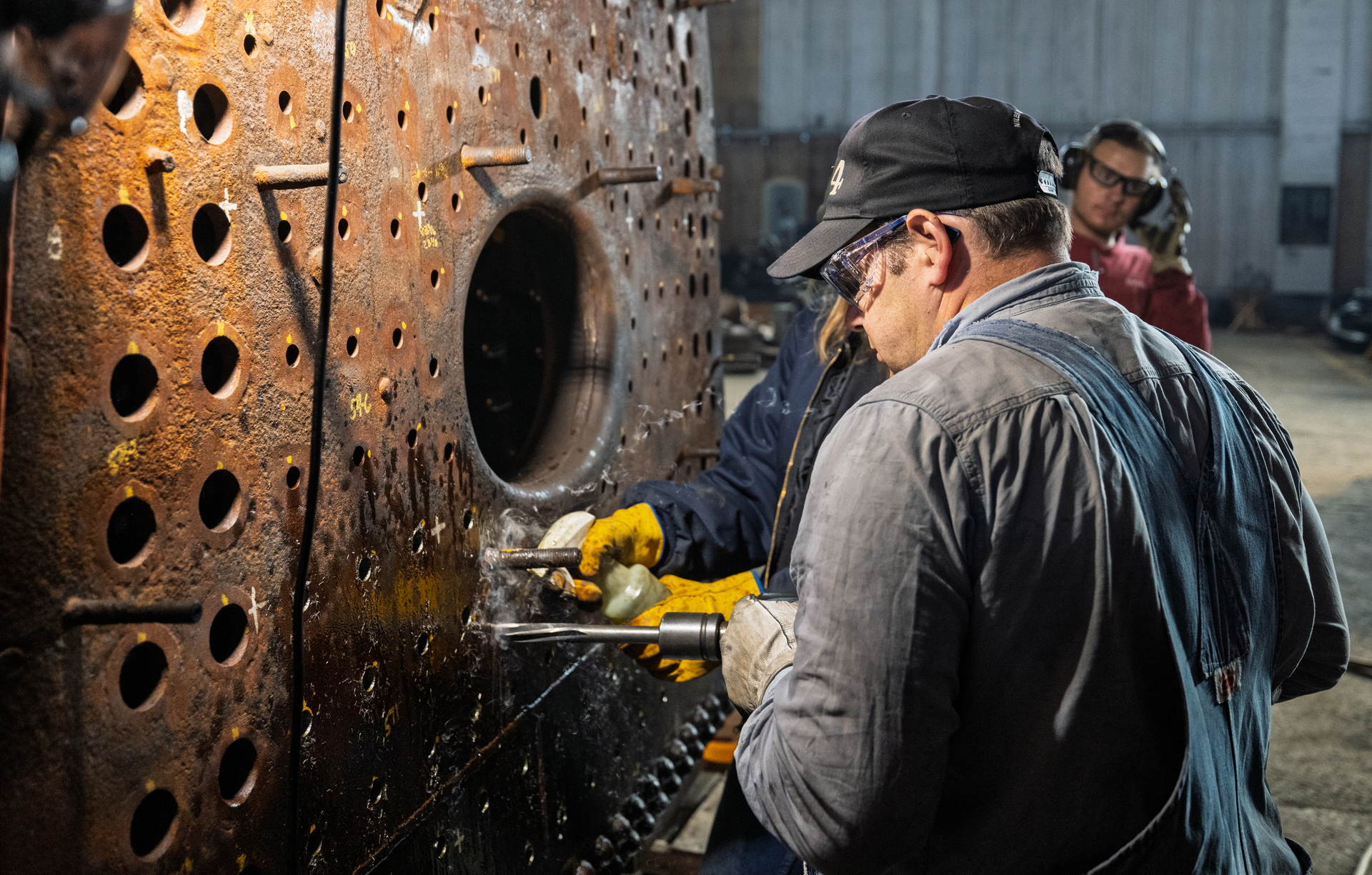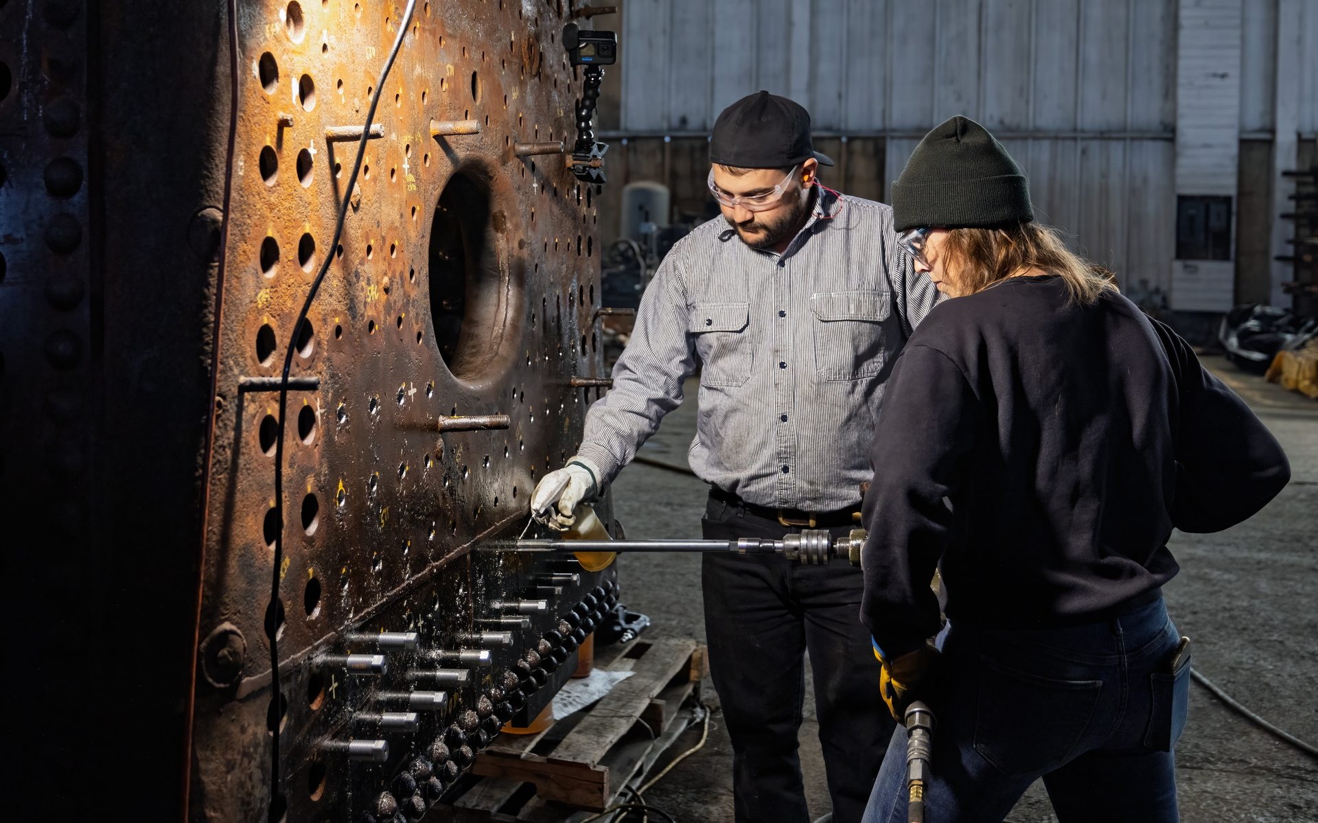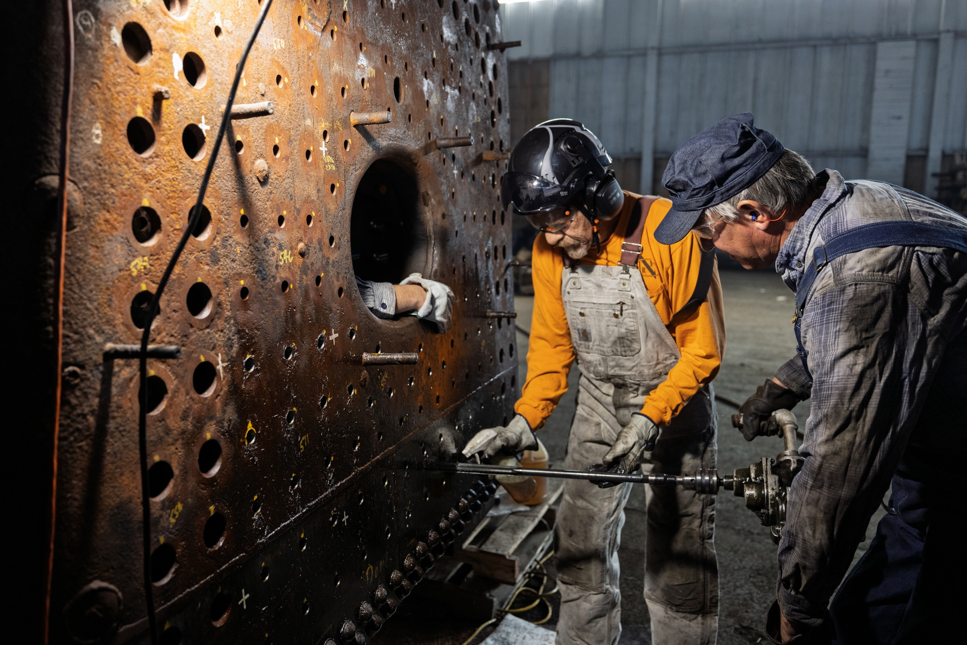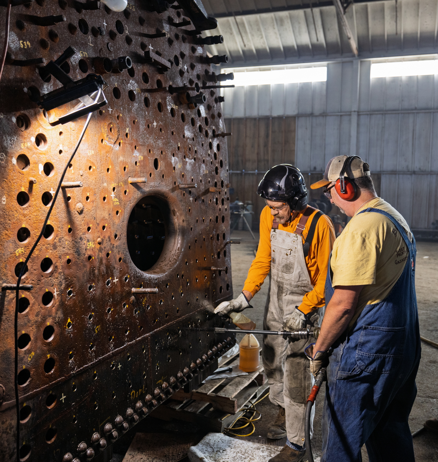 On the weekend of October 26th and 27th, a crew of six volunteers from our Niles Canyon Railway Steam Department headed north to the shop of our contractor, Stockton Locomotive Works, to do some more work on the boiler for our Southern Pacific steam locomotive #1744. Two other crews of volunteers had already gone up at different times between late 2023 and late 2024 to supplement our contractor’s resources since the boiler is seeing significant rebuilding.