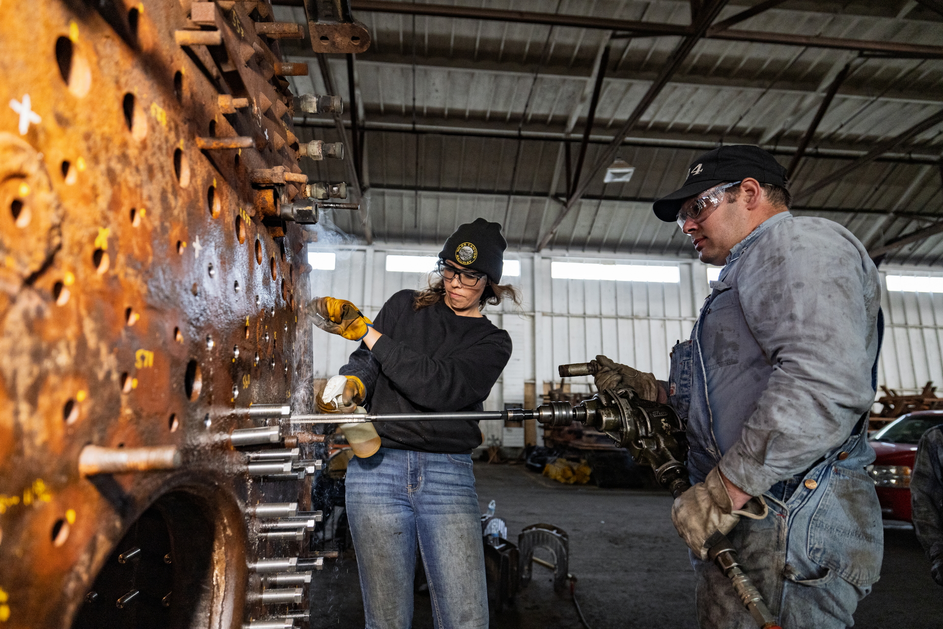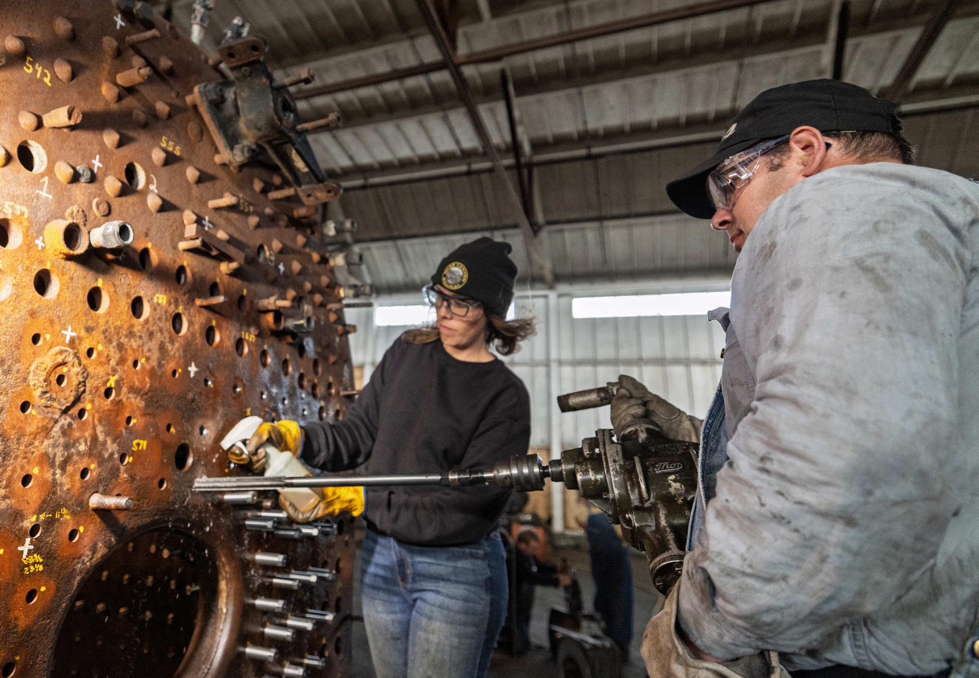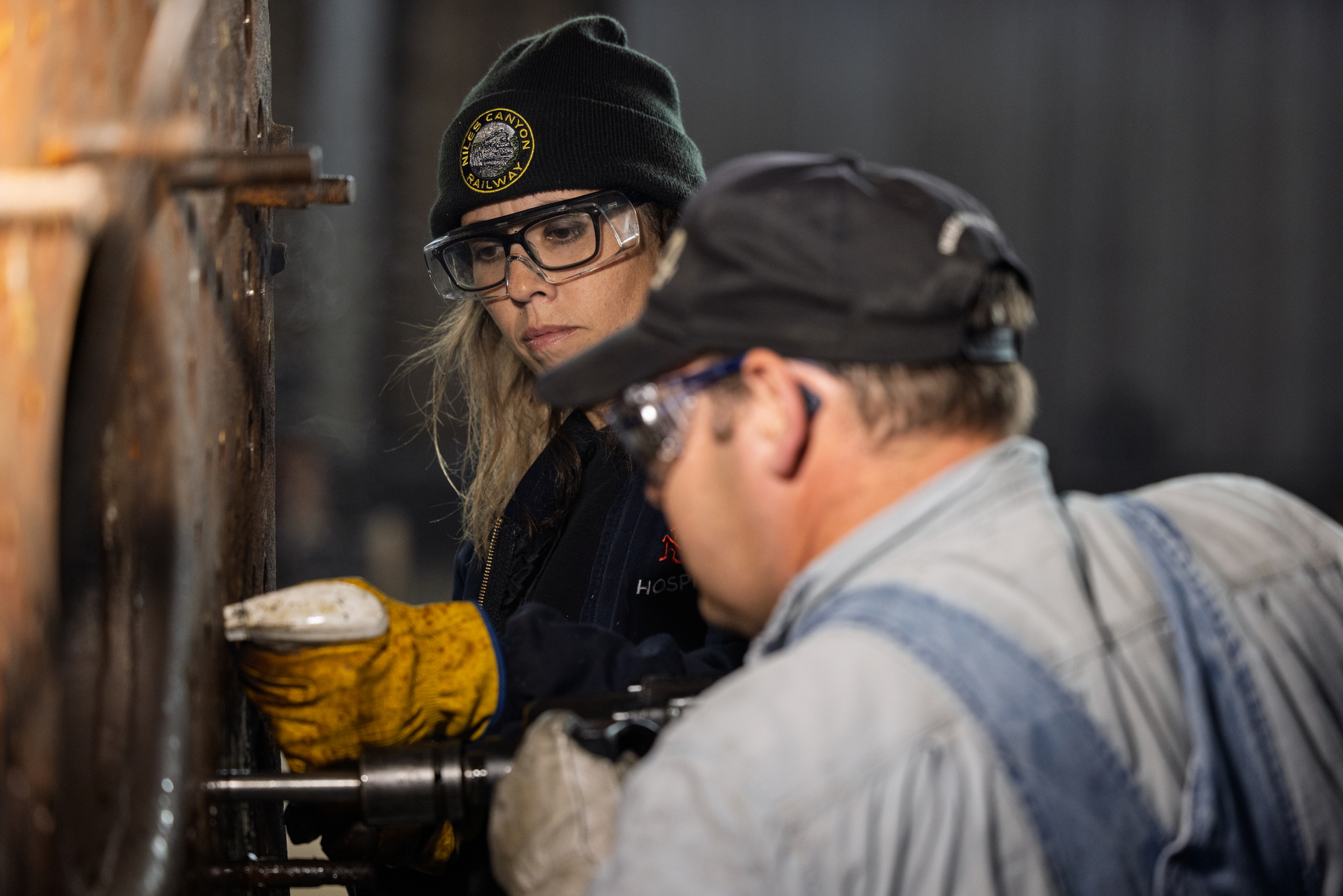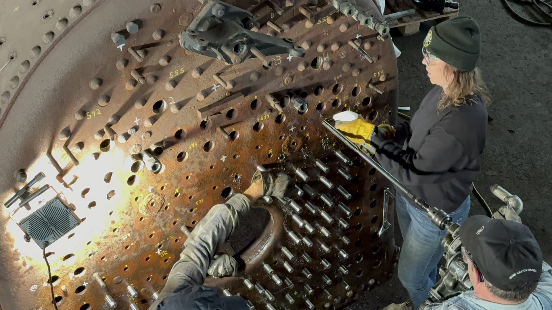 With Stockton Locomotive Works owner (yellow shirt), Stathi Pappas, and NCRy, volunteer, Charlie Franz, looking along, NCRy Steam Department volunteer, Gerald DeWitt, reams out one of the staybolt holes with a 3/4″ impact wrench. This work is hard so volunteers made frequent changes to who was doing the work to let people have a chance to rest. Photo by Christopher Hauf – Used with permissionVolunteer, Justin Legg, has taken over the reaming with volunteer, Sarah Fritz, handling the oiling tasks to help the reamer cut successfully through both the out and inner sheets. Photo by Christopher Hauf – Used with permissionReaming continues. Note the backhead is devoid of any new staybolts. This would change by the end of the weekend. Photo by Christopher Hauf – Used with permissionThe NCRy Steam Department is fortunate to have formed many partnerships with other groups over the years. One of those is the Roots of Motive Power in Willits, CA. One of their volunteers, Ed, wanted to come lend a hand for a day, and who were we to turn down another set of hands. He was a huge help, and we appreciate the continued cooperation between the two groups. Photo by Christopher Hauf – Used with permissionWith the bottom row reamed, Stathi demonstrated the tapping process for everyone. Half of this team had done this type of work before, but half had not so it was good to see how it was done. With the first few complete, the tooling was handed over to Steam Department Head, Alan Siegwarth, to continue. You will note the hand in the firebox door. Given the length of the special boiler tap, it was fed into the hole and allowed to cut all the way through to a blank area on the other end where the volunteer in the firebox would remove the tap from the hole, feed it back out of the firebox before being run into a new hole. Photo by Christopher Hauf – Used with permissionTapping continues.., Photo by Christopher Hauf – Used with permissionVolunteer, Charlie Franz, supports and guides the tap from inside the firebox. The tap will be fed all the way through and passed back out to the outside team to be inserted in the next hole to be tapped. Photo by Christopher Hauf – Used with permissionVolunteer, Justin Legg, has now taken his turn while Gerald continues to oil to tap to keep it running freely through the sheets. Photo by Christopher Hauf – Used with permissionAnother volunteer trade and Sarah Fritz has now taken up the air motor to keep tapping as Charlie oils. You can now see the first staybolts in place so this was the next set of holes to get attention. Photo by Christopher Hauf – Used with permissionMore tapping later in the afternoon. Photo by Christopher Hauf – Used with permissionTapping around the firebox door. Photo by Christopher Hauf – Used with permissionOur contractor has also been rebuilding 1744’s axle driving boxes. Here we are looking through one of them at 1744’s boiler barrel. Photo by Christopher Hauf – Used with permissionBack to reaming with Justin and Alan. We are getting higher on the firebox. Photo by Christopher Hauf – Used with permissionGerald watches at staybolts are inserted to a specific depth to allow for eventual peening on the inside, followed by the bolts being cut and peened on the outside as well. Photo by Christopher Hauf – Used with permissionA top down view as tapping is underway on Sunday morning. Photo by Christopher Hauf – Used with permissionAlmost there. Photo by Christopher Hauf – Used with permissionJust in case we forget which locomotive the boiler is for. Photo by Christopher Hauf – Used with permission