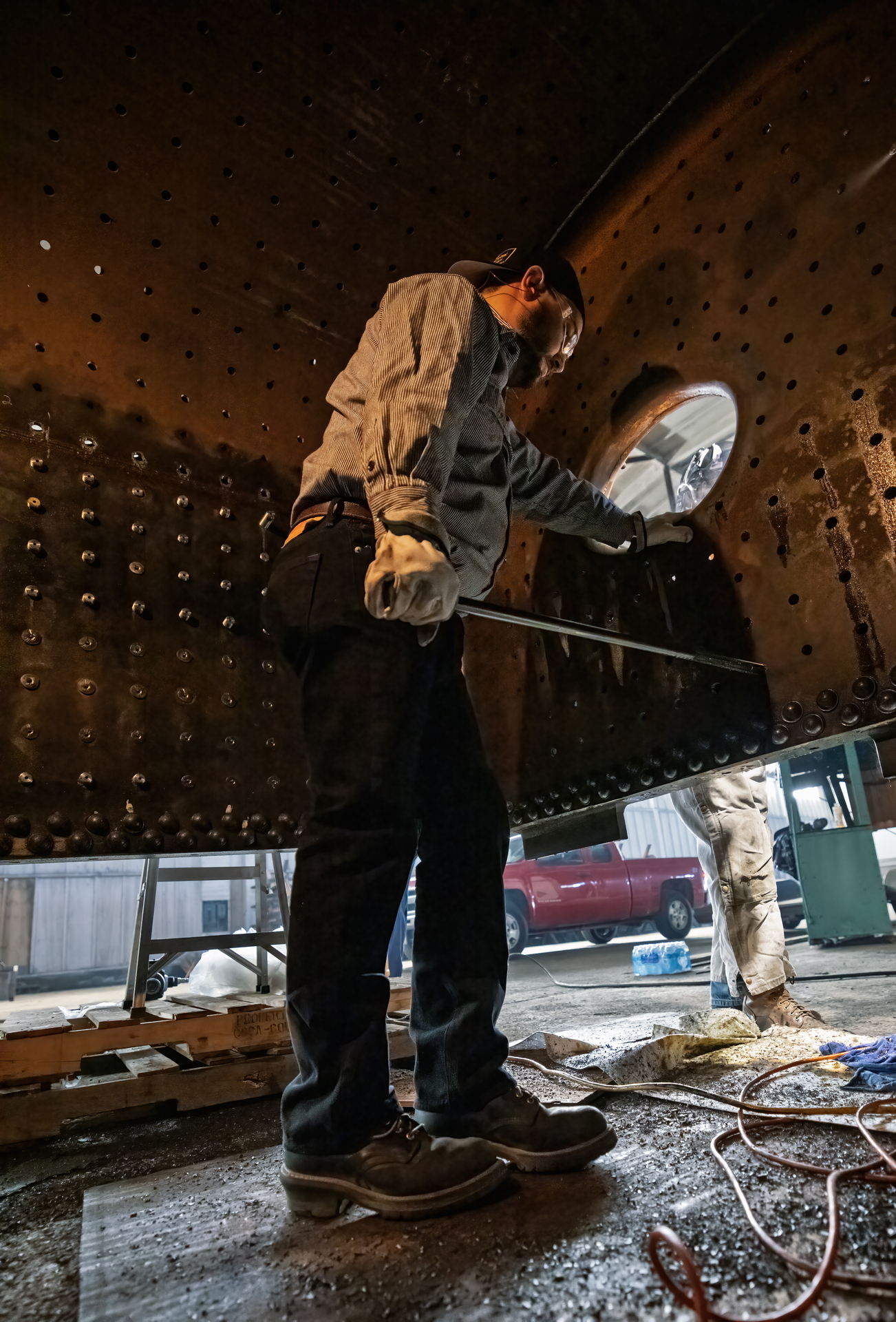 A bit like having Thing from the Addams Family, Gerald adjusts the bolt depths from inside the firebox. Photo by Christopher Hauf – Used with permission