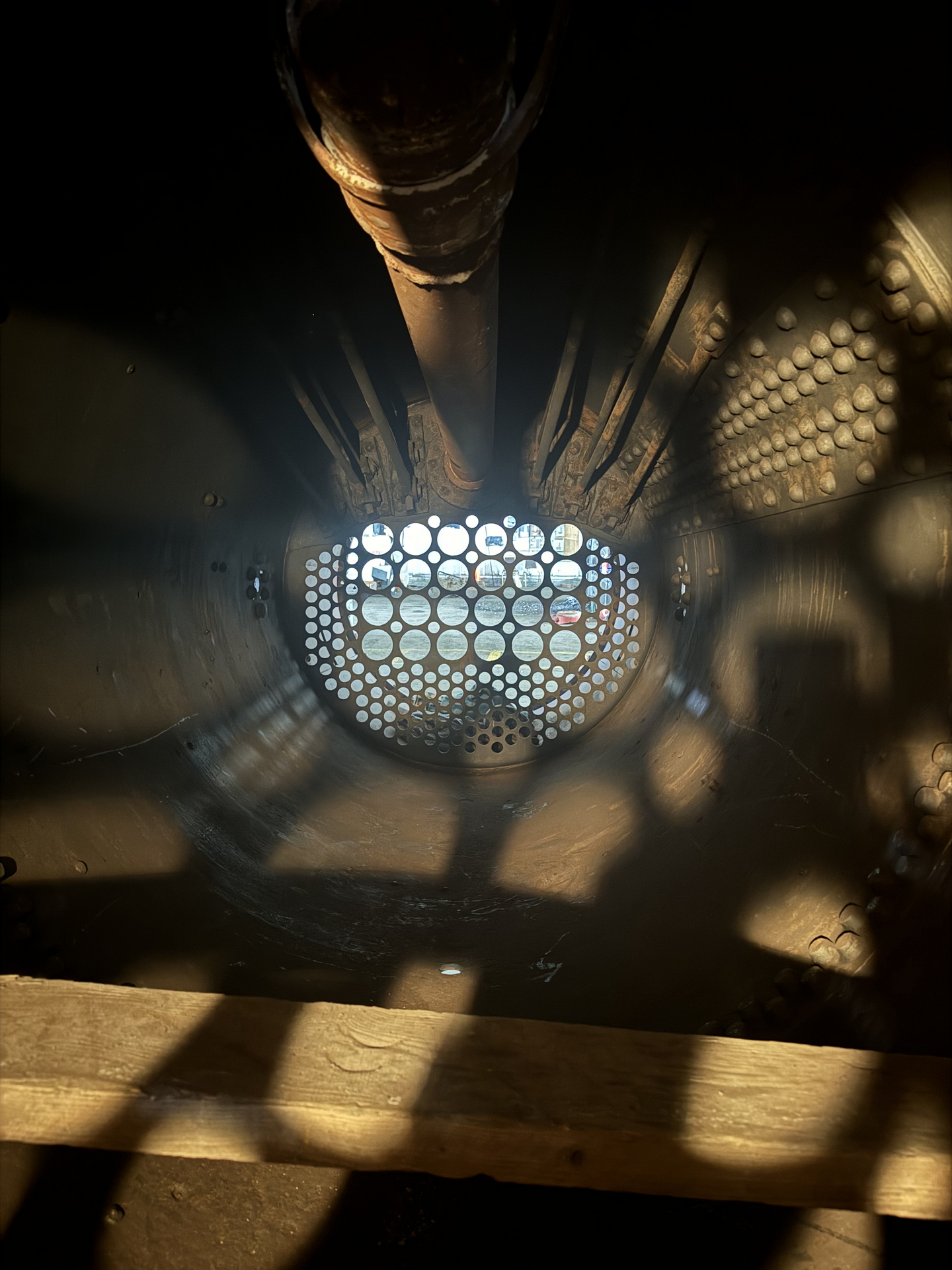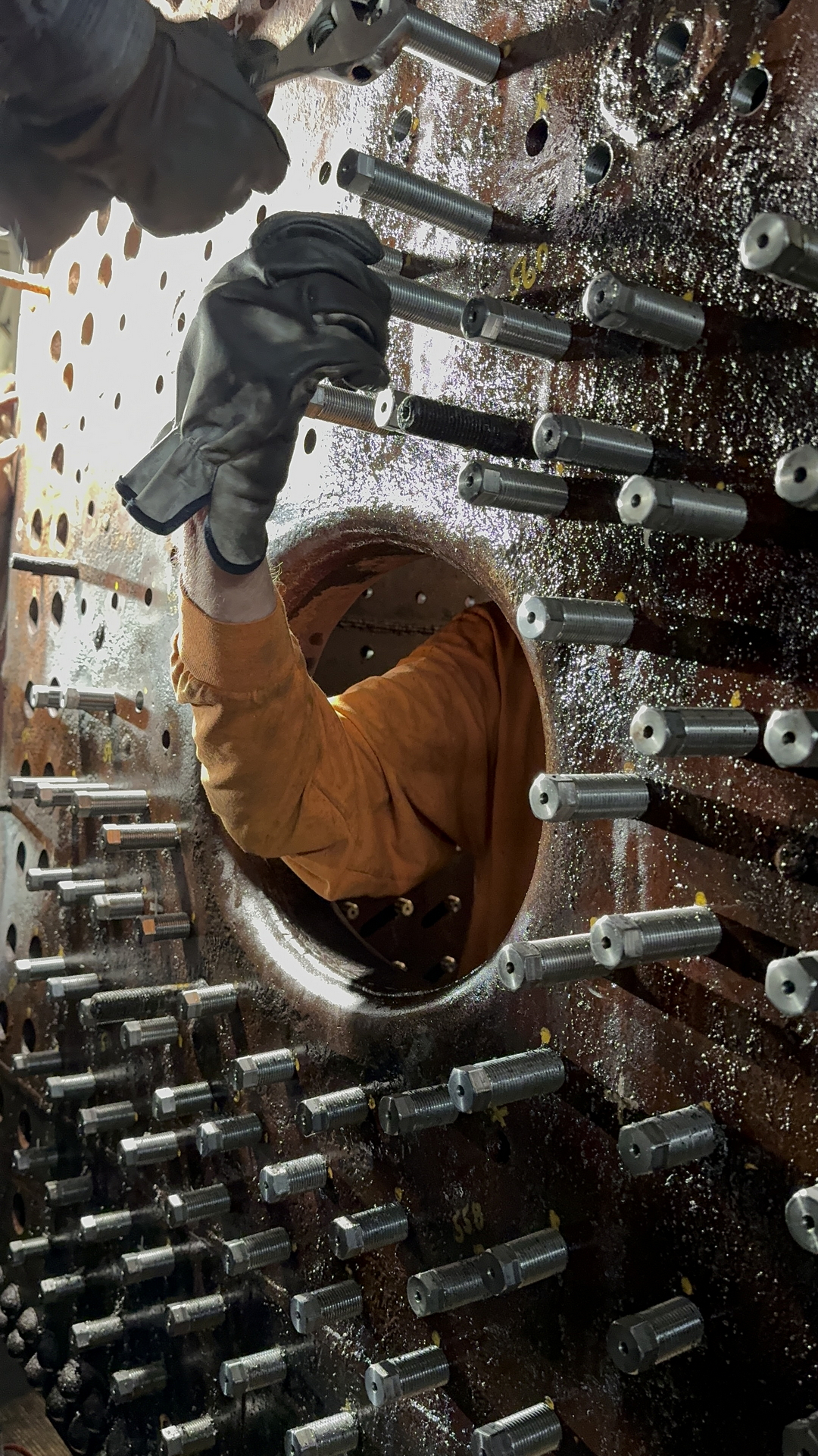 More bolts going in. Photo by Christopher Hauf – Used with permissionGerald watches from inside the firebox where you can see some of the complete rigid staybolt work on the one side sheet and all of the holes in the crown sheet that will receive flexible staybolts. In all, 1744 will get over 1500 new staybolts inserted! Photo by Christopher Hauf – Used with permissionSarah takes her turn Sunday AM on the reamer. Just a few more holes to go. Photo by Christopher Hauf – Used with permissionA look at the boiler from the inner tube sheet toward the smokebox tube sheet. This will eventually filled with new flues and tubes. More work still to do! Photo by Christopher Hauf – Used with permissionInserting the last of the bolts near lunchtime on Sunday. Photo by Christopher Hauf – Used with permissionComplete! Photo by Christopher Hauf – Used with permissionThe backhead with all of the rigid stays complete and the engineer’s side sheet with both the rigid and flexible stays & sleeves installed. Photo by Christopher Hauf – Used with permissionThe fireman’s side again with all the rigid bolts in place. Photo by Christopher Hauf – Used with permission