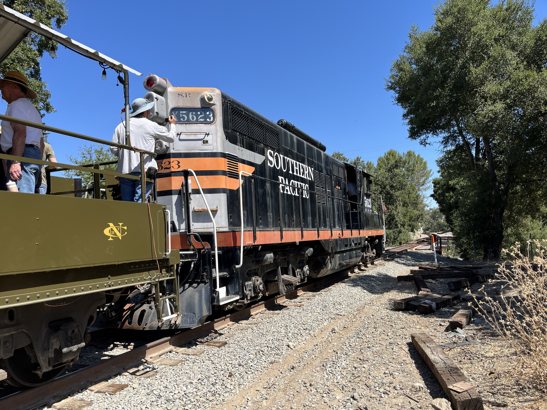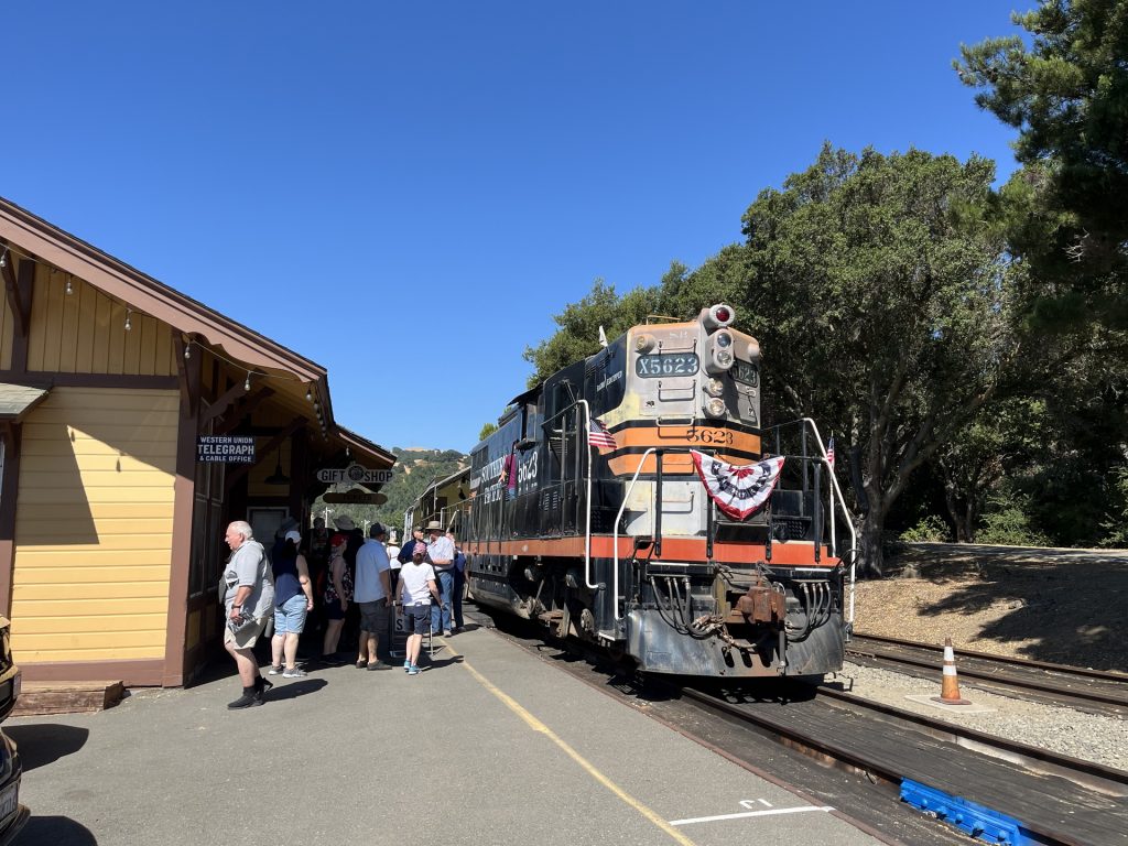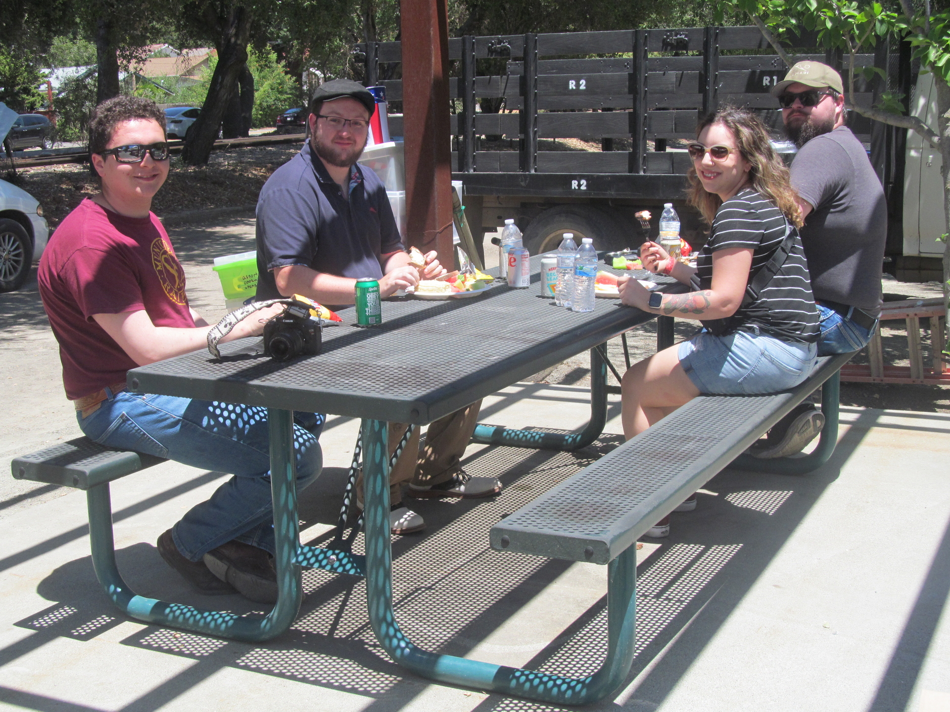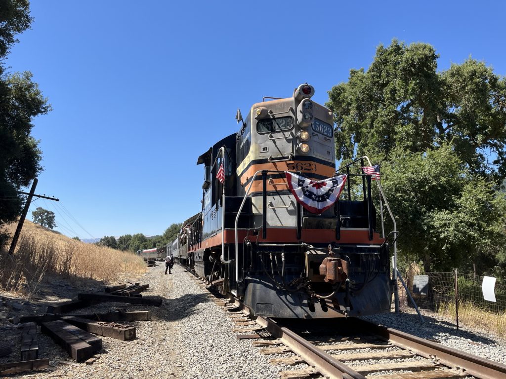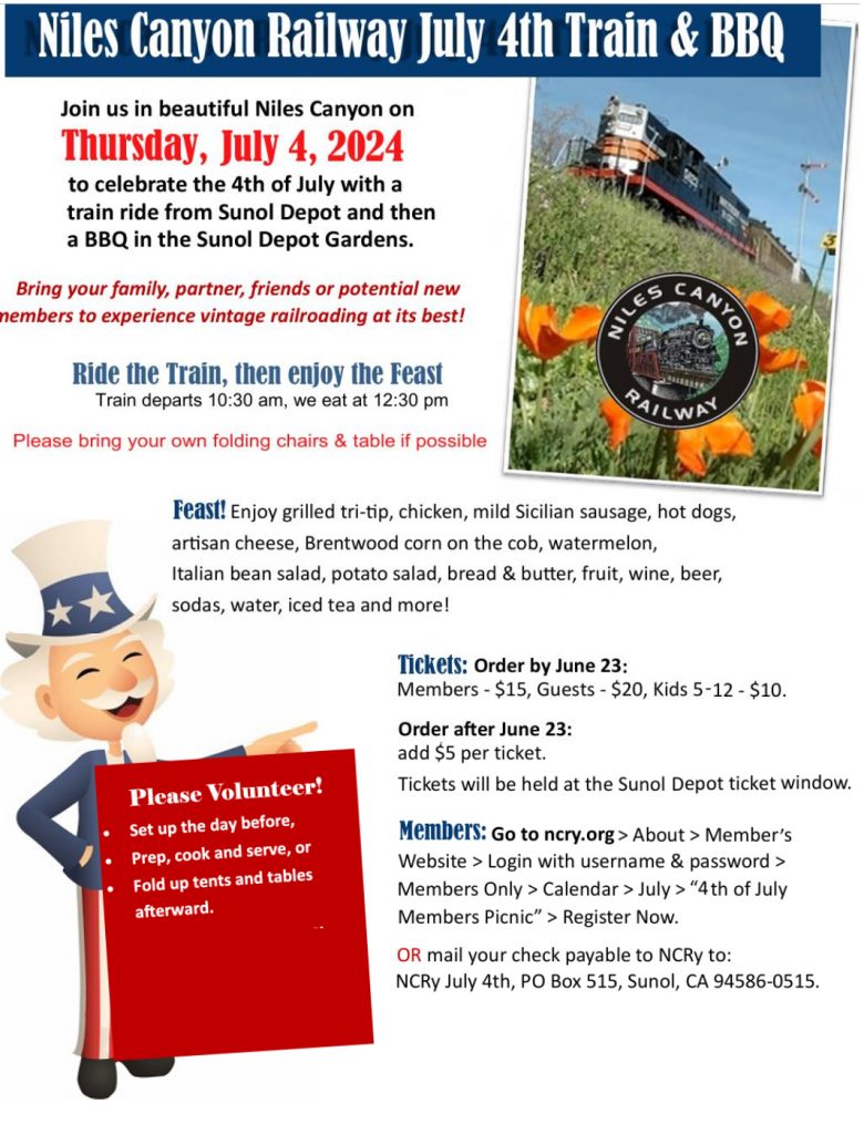 As has been our yearly tradition for many years, the Niles Canyon Railway hosts a picnic and train ride on the 4th of July for its members and guests. This year was no exception with somewhere over 150 people in attendance. They enjoyed a great BBQ lunch in the Sunol Depot Gardens, and a train ride which took the train from Sunol all the way east to the new end of track at Happy Valley Bridge then all the way west to Niles only to then return to Sunol.