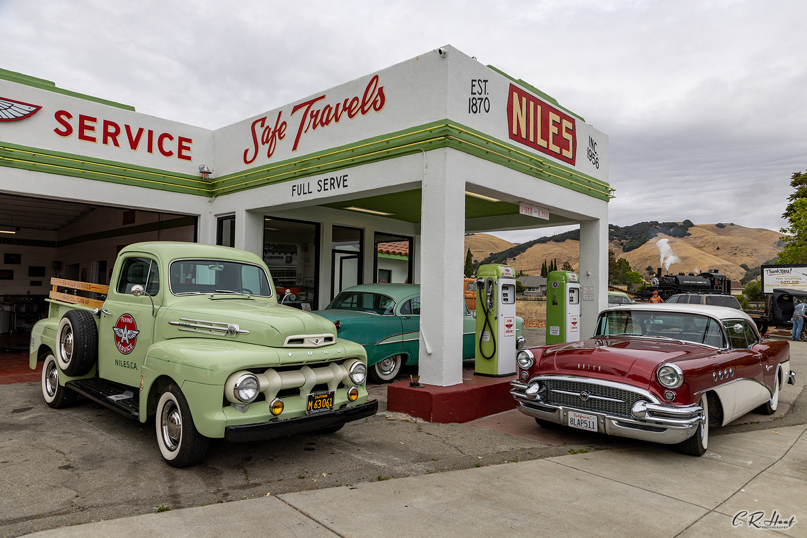 The engine as turned in Sunol to face its normal east. It is seen here from the restored Niles Flying A gas station in downtown Niles.