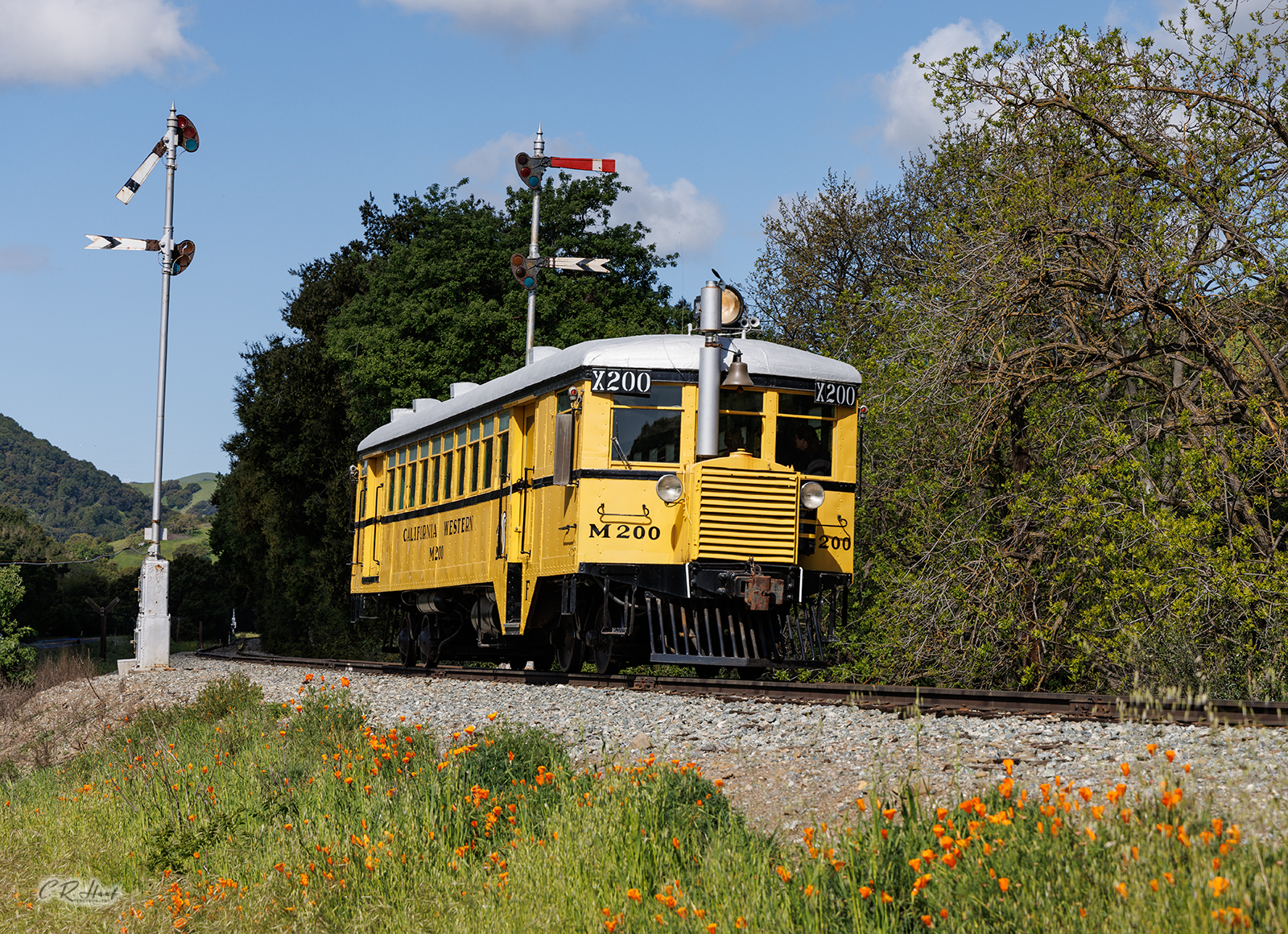 Taken on April 6, 2024 of our M200 railcar heading into Sunol, we can start to see blooms! We hope you will join us to hopefully see more of the results of the Mudball Express. Image by Christopher Hauf – Used with permission