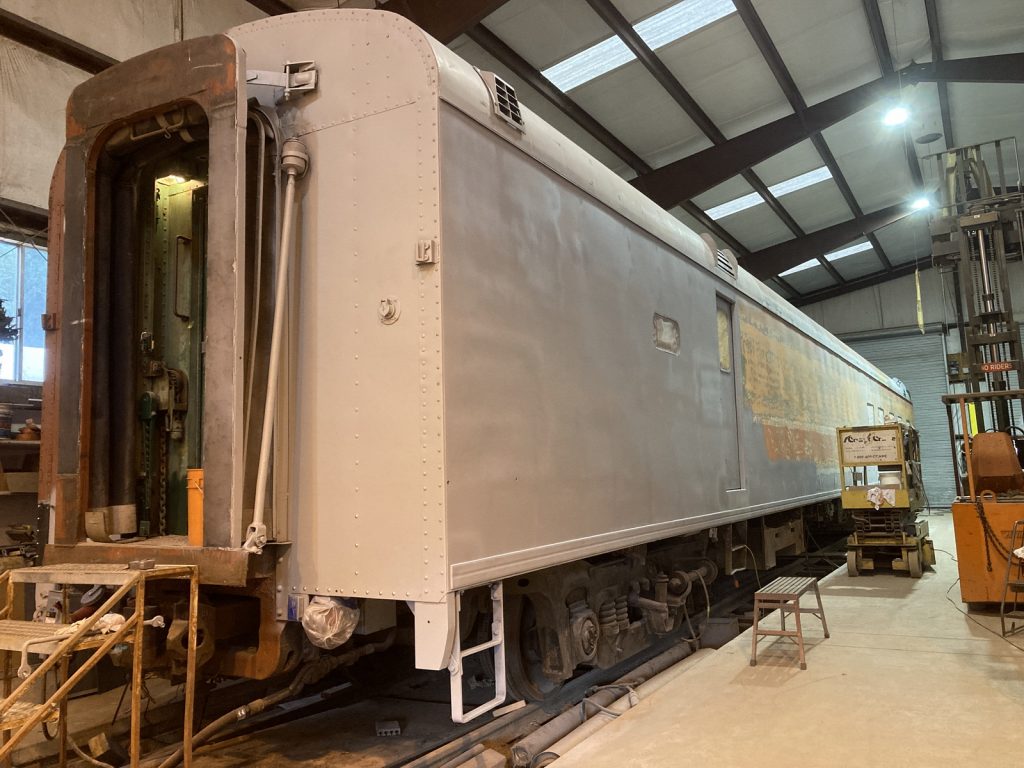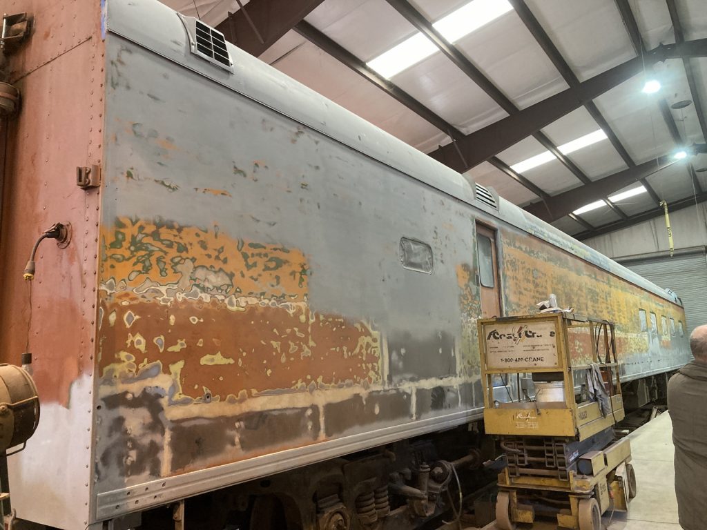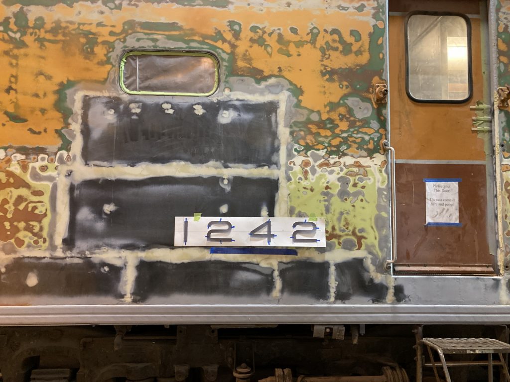 Here is a timeline of photos supplied by Howard showing just a few of the different steps taken on the kitchen side of the car to remove and replace corroded steel, prep and prime the car for paint, and start the complex four color paint scheme including the lettering on the car. These photos are by no means comprehensive of all of the incredible work our volunteers have done on this side of the car over the past year plus; work which is now being continued on the opposite side of the car to a similar degree.