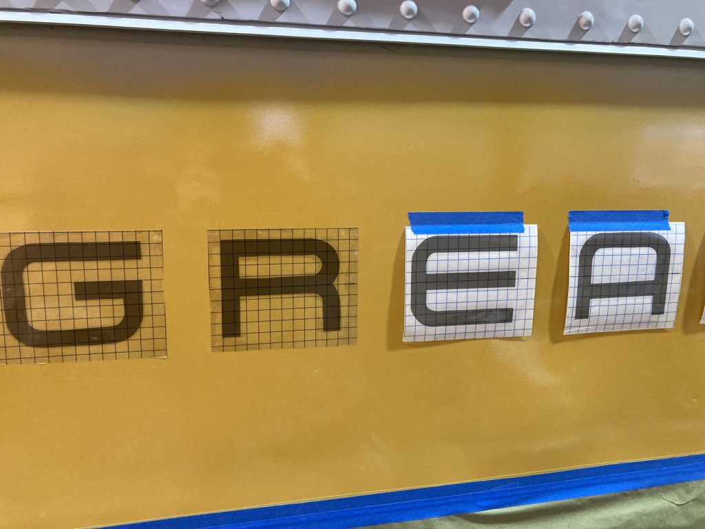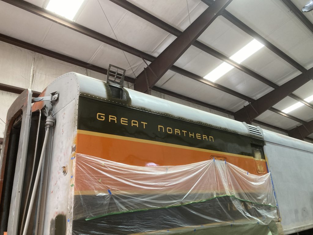 Over the past several years, a dedicated team has been working inside and out to restore our Great Northern Railway Ranch Car ‘Hidden Lake’ which was donated to our Niles Canyon in February 2019. On the exterior, this effort has been led by master craftsman, Howard Wise, who is also the driving force behind the restoration of Southern Pacific #9010. With a lot of new steel installed along the roof line and throughout the kitchen side of the body, Howard has recently turned his skills from metal work to painting and lettering; starting the four color Great Northern paint scheme on the kitchen end of the car as a first step to continuing the work down this side of the car and eventually across the whole car.