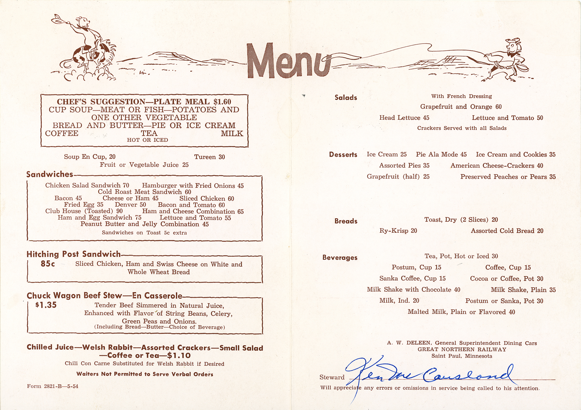 So what can we order? A Plate Meal of Meat or Fish with potatoes and another vegetable along with a cup of soup, bread & butter and pie or ice cream for dessert with a drink of coffee, tea or milk included all for $1.60! Various sandwiches are available all for less than $1.00 each along with Chuck Wagon Beef Stew for $1.35. Various salads and desserts are also offered including Pie Ala Mode where the type of pie is unknown. It appears this menu was introduced in May of 1954 based on the form code. Our Steward for this day on this particular car was Mr. Ken McCausland.
