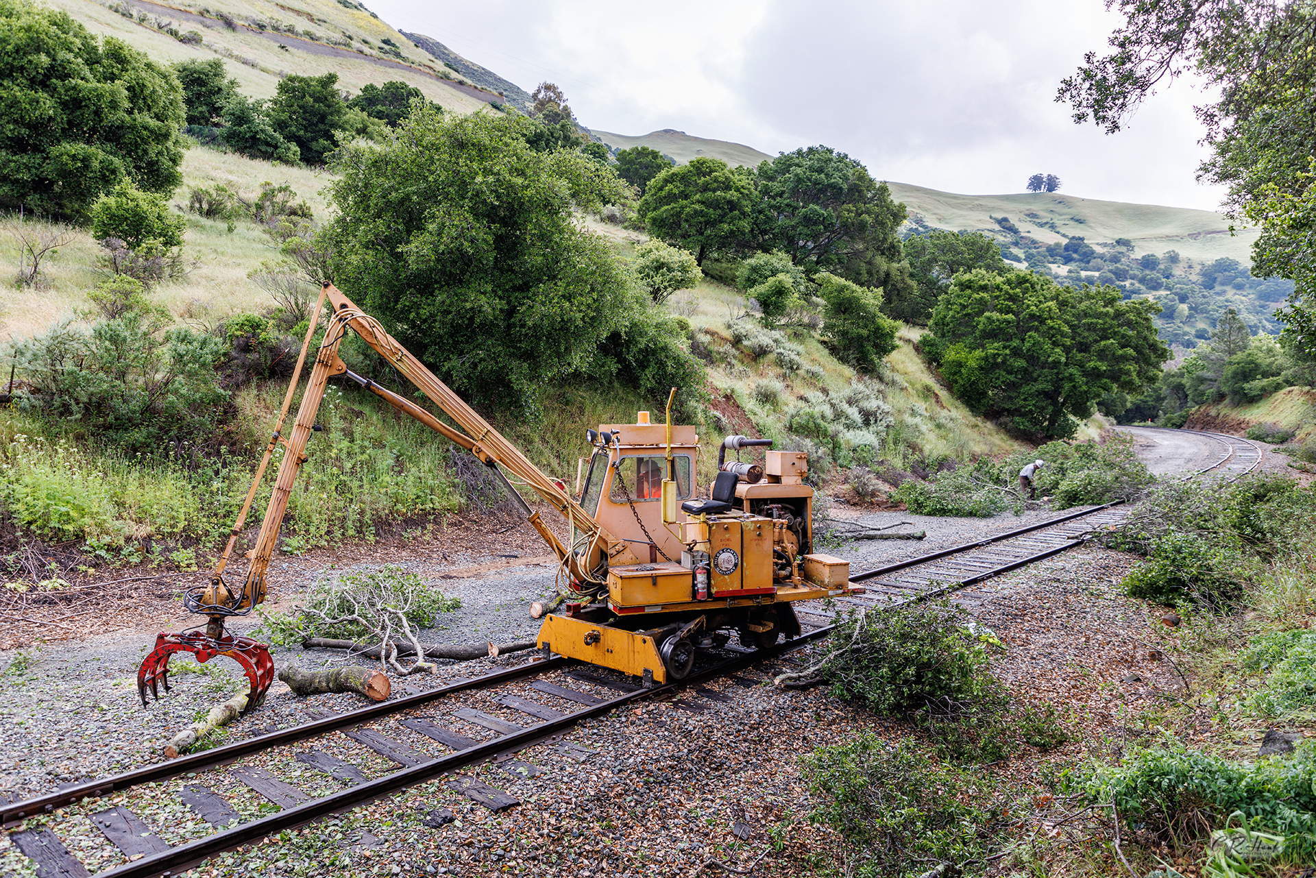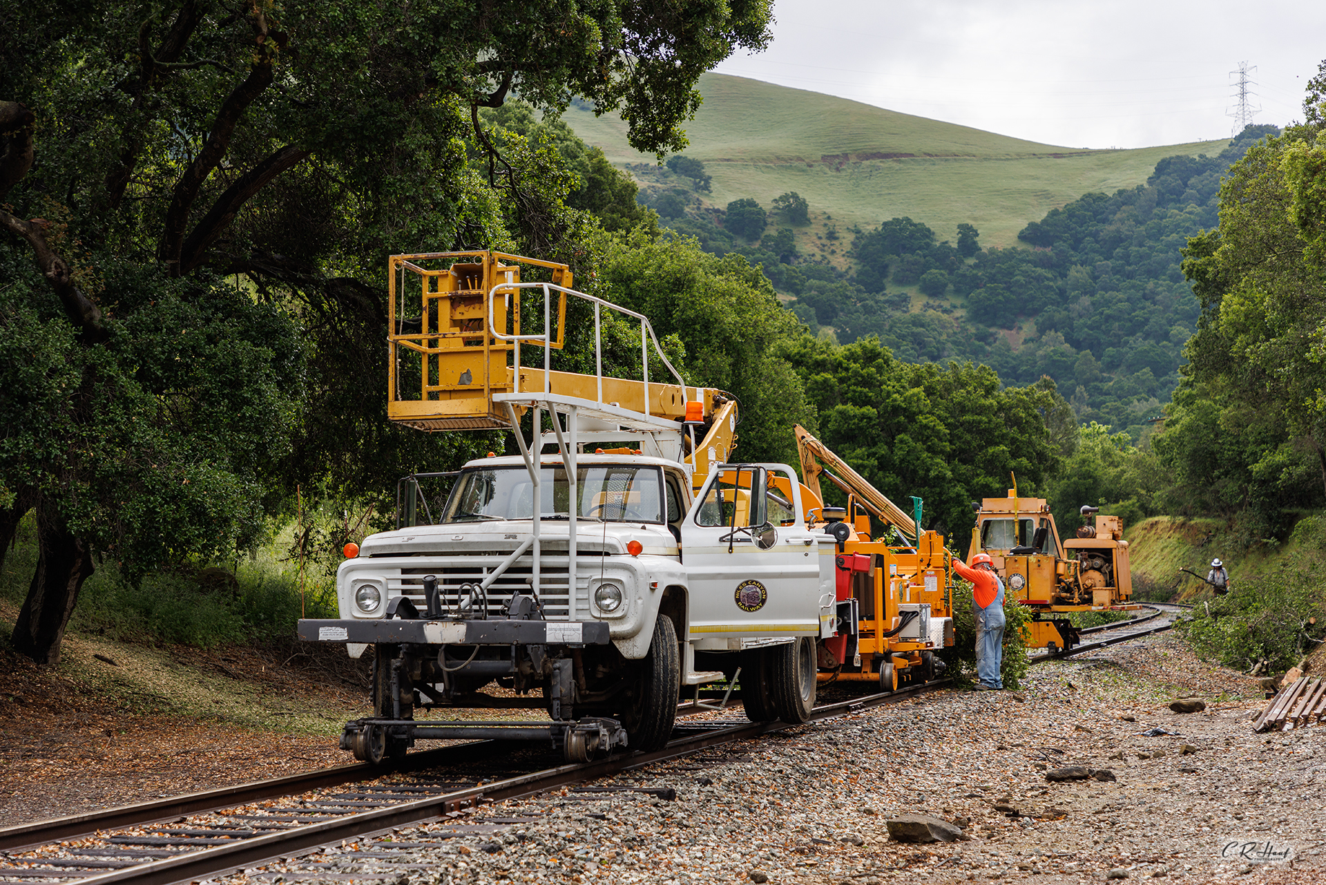 Volunteer members of the Maintenance-of-Way (MOW) Department, dedicated to trimming back, and in some instances removing, trees and brush along the right-of-way to comply with Federal Rail Administration rules for clearance and sight-lines around curves.