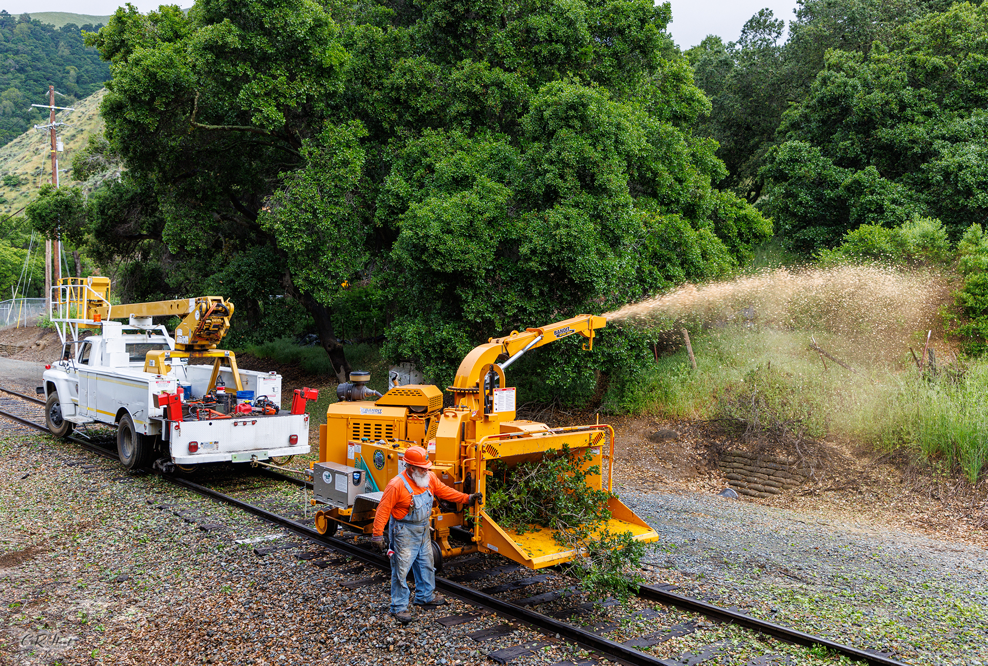 - We trim trees back away from the rails and chip the “slash” (felled branches) using our own specially designed railroad-adapted limb chipper.