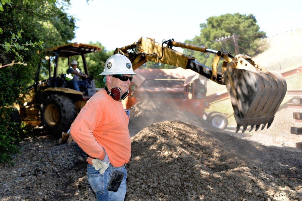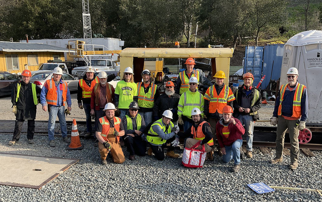 Unlike our Wednesday Maintenance-of-Way (MOW) volunteer warriors who repair and maintain the existing track and structures, and our signal maintainers, our east track building crew concentrates on the construction of new track east, closing the gap to Pleasanton. The east track building takes place the first Saturday of each month. We meet in Brightside yard at 8am, load the MOW train, have a safety meeting and head east.