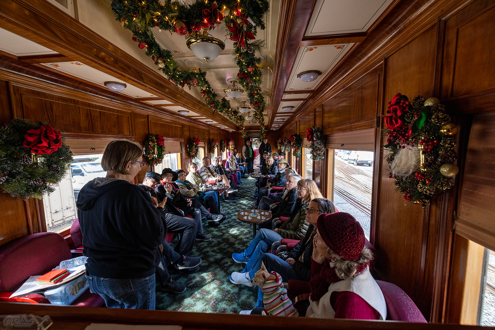 In our First Class cars, we have three volunteers to aid in our guests first class experience. We have a car captain and two helpers. One person greets people on the platform while the other two serve our guests their complimentary drinks and snacks.